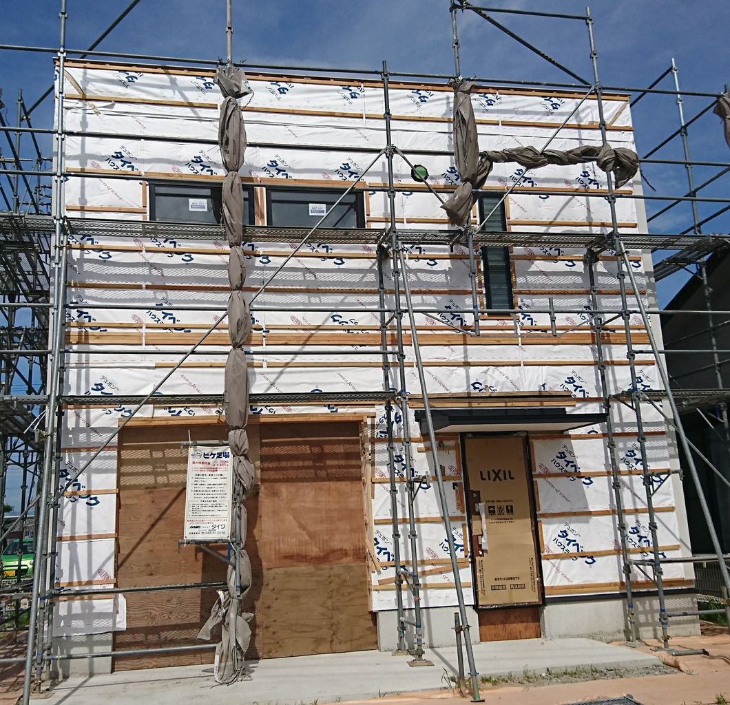 足場の防護ネットは、風の影響を受ける為、足場事態が倒れる可能性が出て危険なので開けてきました。ガレージ入り口のシャッターがまだ付いていないので、そこからの雨風の侵入を防ぐため板を打ち付けてもらいました。あとは、ものが飛んで来ないことを祈るばかりです。