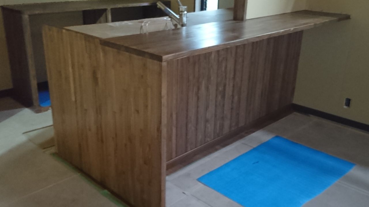 これは、カウンター下に希望された木部分です。無節の杉板に、カウンターと同じ色で塗装しました。