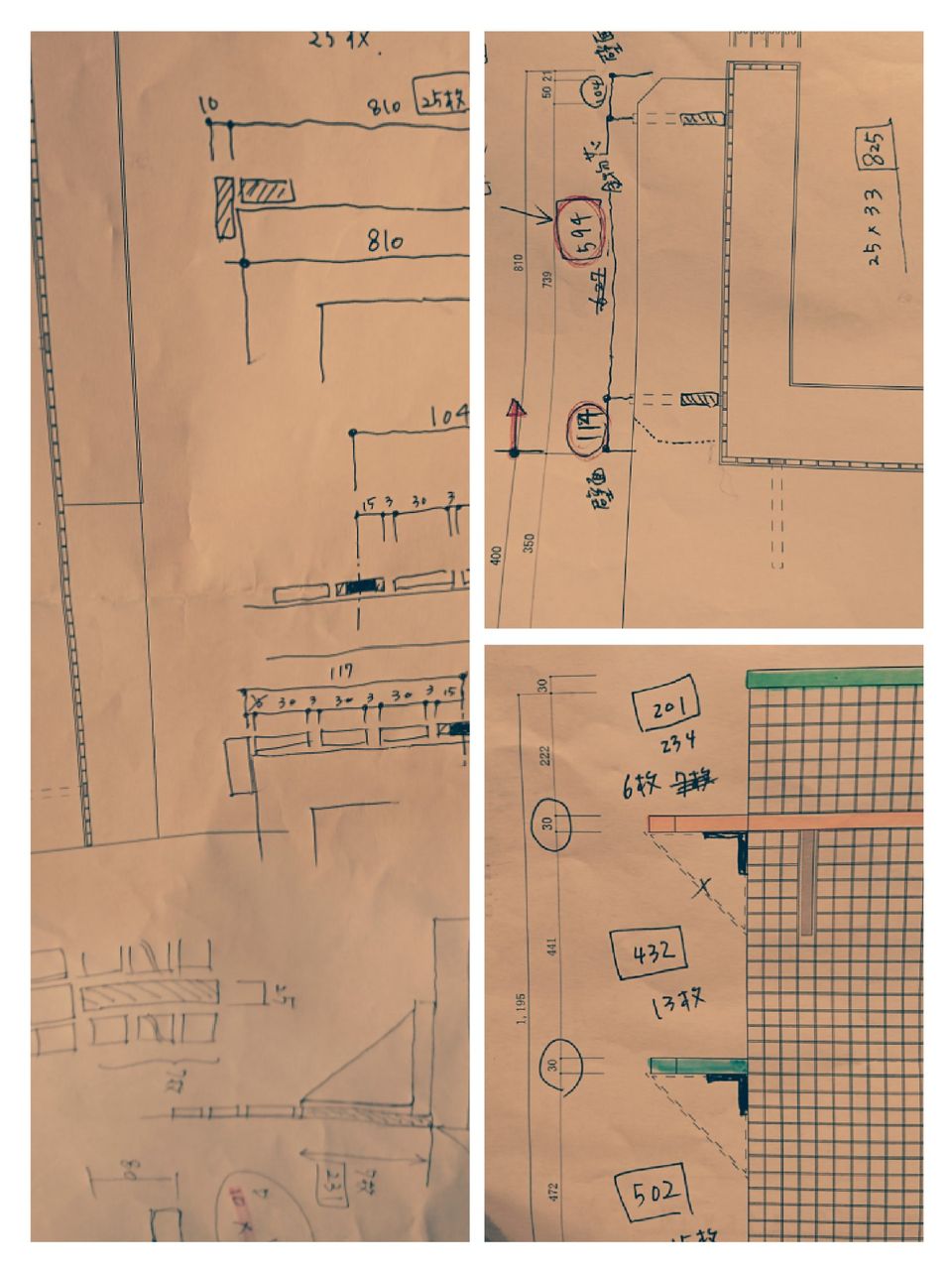 次はタイル割りです。パソコンで図面を書いているときは完璧と思っているのですが、大工さんに立体的な見え方をきくとなるほど!と思うことが沢山あり、目地幅の取り方も平面では気づかないことがある事がわかりました。