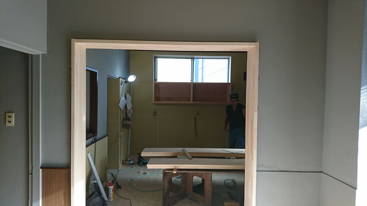 ↑木枠がコンクリートブロックの矩体に食い込んでいたため綺麗に外すことが出来ず、新規で枠を組んだ後隙間部分を二重枠にする提案を塗装やさんにいただきました。ちょうどN様の建具取り替え補修で大工さんより提案をいただいた方法と同じだった為、より高級感が出る事が想像でき、悩むことなく即決出来ました。
