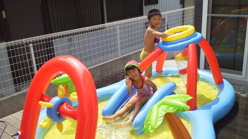 大はしゃぎして遊んでいました。リビングから続いているウッドデッキにつくるプールは子供たちの