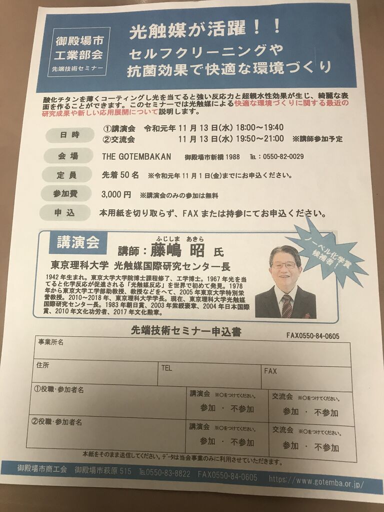 ノーベル賞候補で、光触媒の研究で有名な藤嶋昭氏の講演会のチラシを渡されて、SNSで宣伝してくれと頼まれました。自分は同友会の例会で行けないのですが、とりあえずFBにUPしときました。