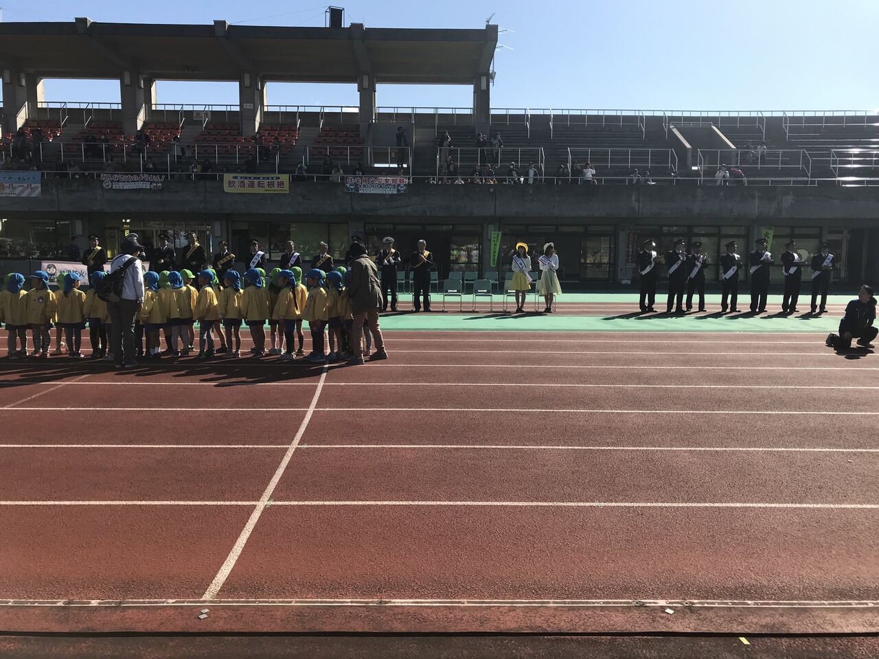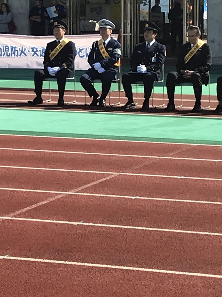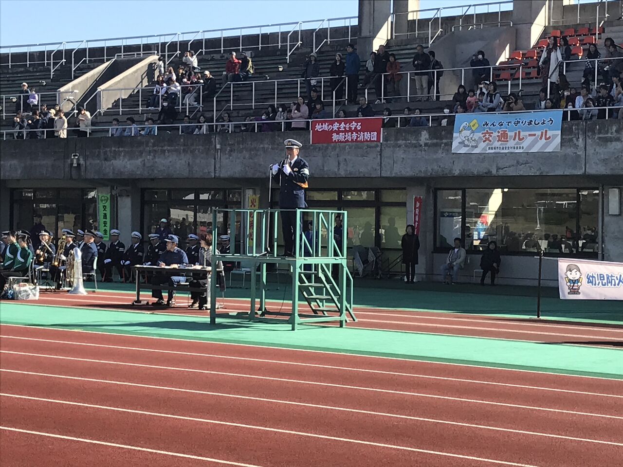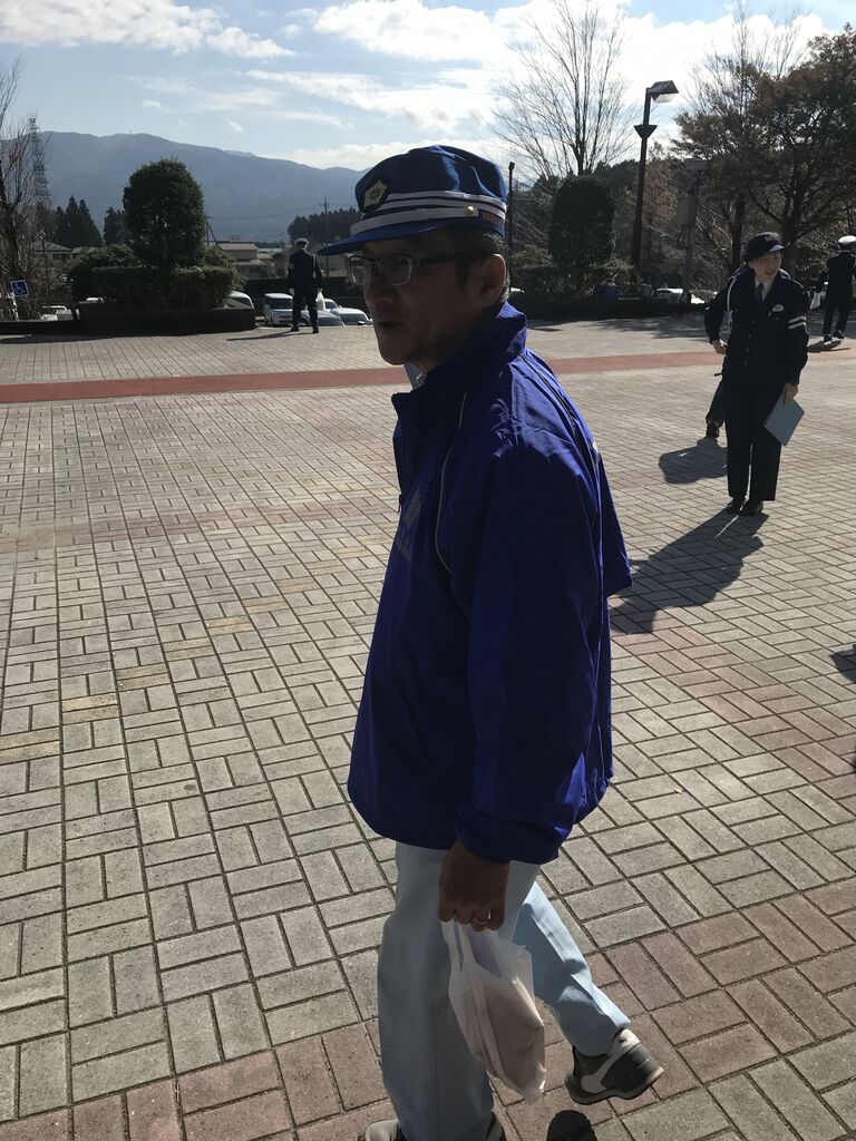 安全運転管理協会のジャンバーと帽子を被った僕。市内の保育園・幼稚園の皆さん。