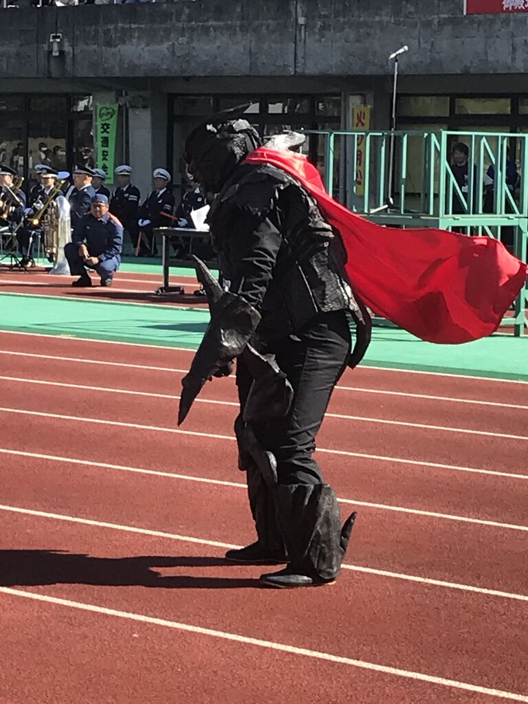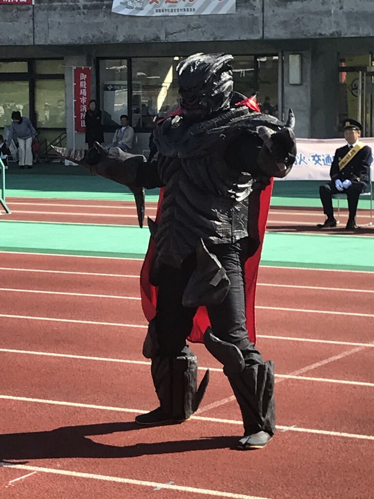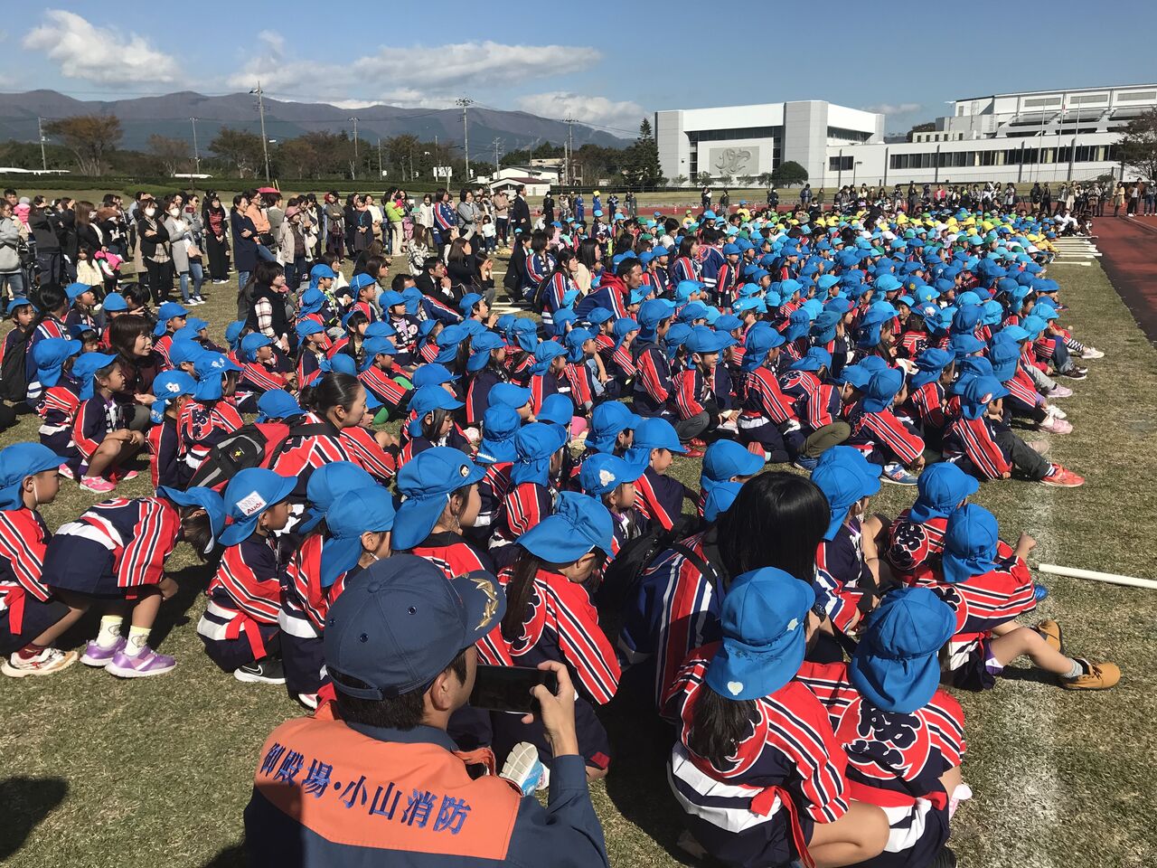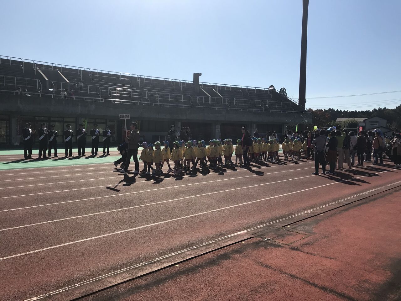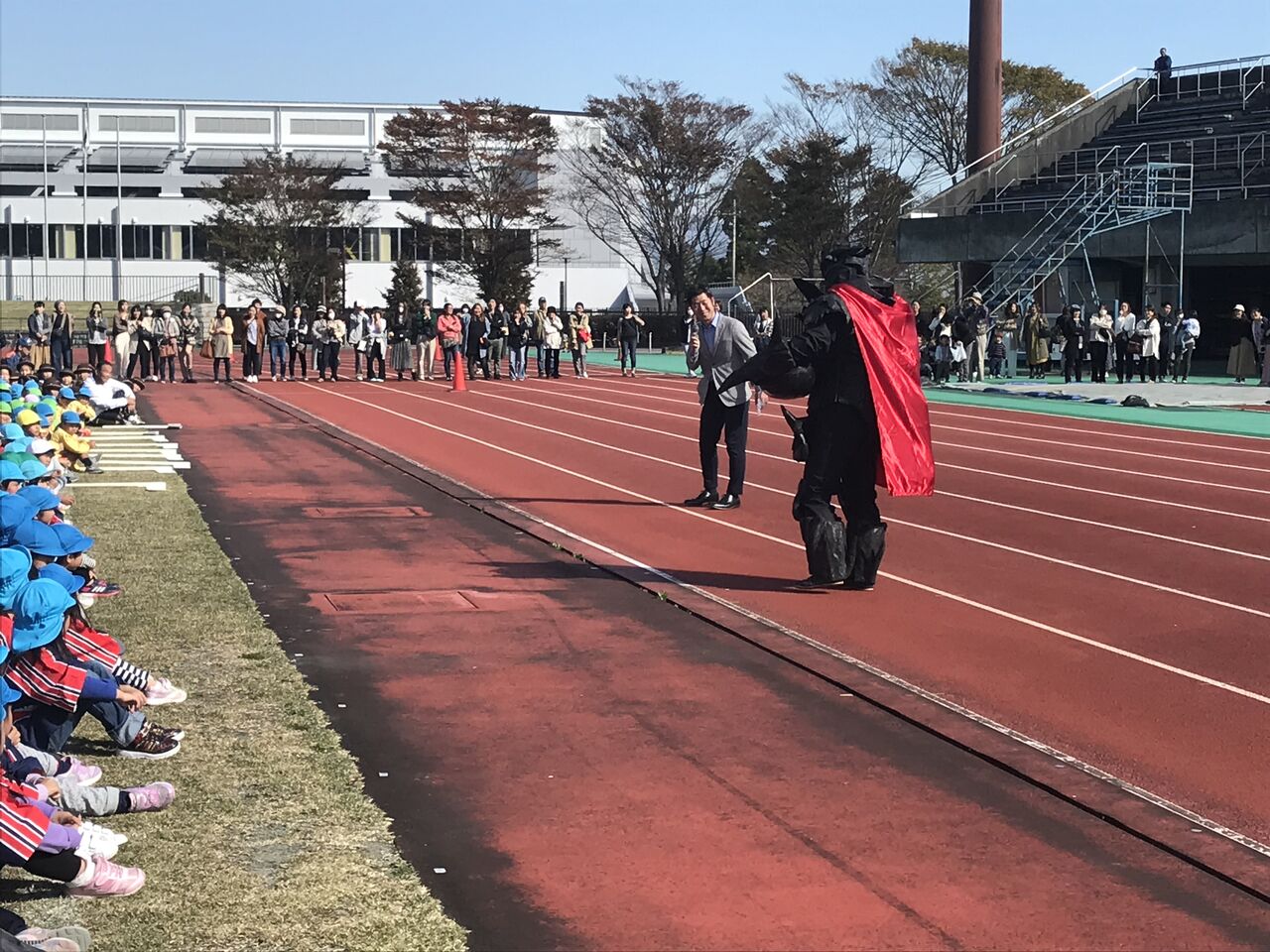 安全運転管理協会のジャンバーと帽子を被った僕。市内の保育園・幼稚園の皆さん。