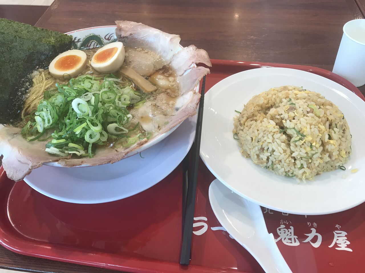 島田の「ナガイ」さんへ向かう途中のSAで昼食。「魁力屋」で全部乗せラーメン大盛と半チャーハン。