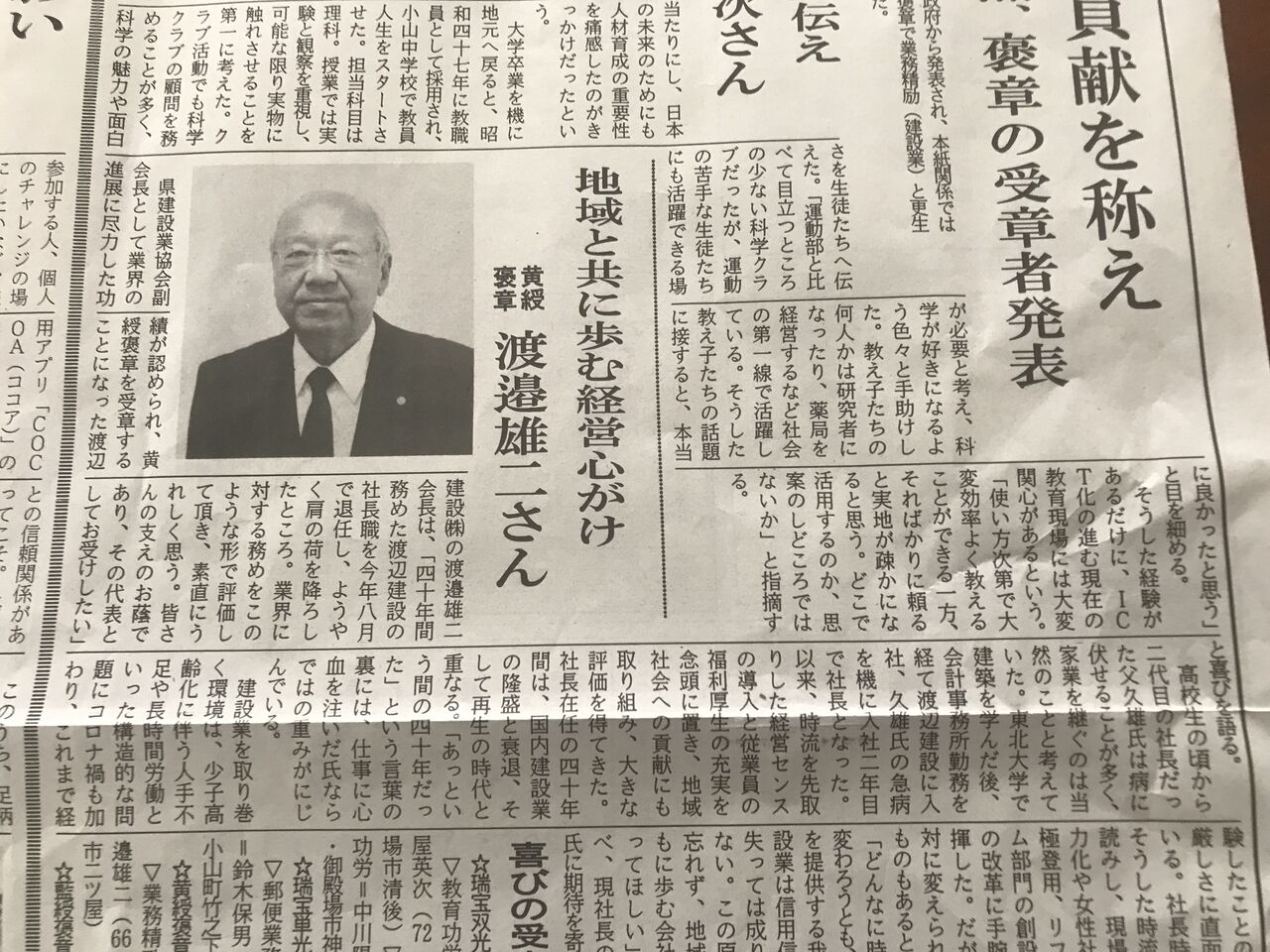 高校の先輩で、建設業界、ライオンズでも先輩の渡邉雄二先輩が黄綬褒章を受章されました。おめでとうございます。