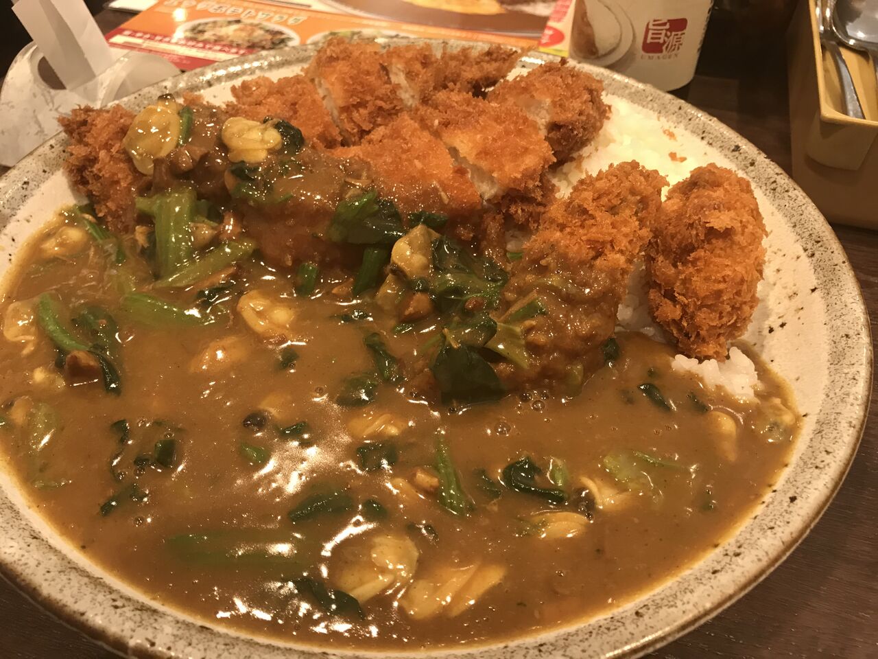 CoCo壱番、チキンフライ、カキフライ、アサリ、ホウレンソウ、ライス300グラム、辛さ普通です。
