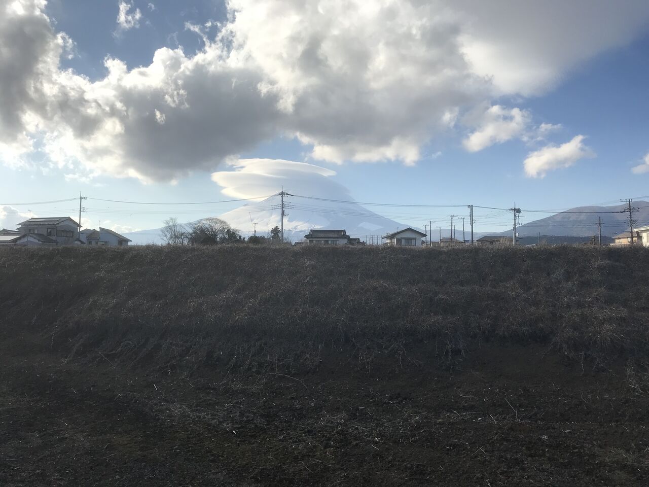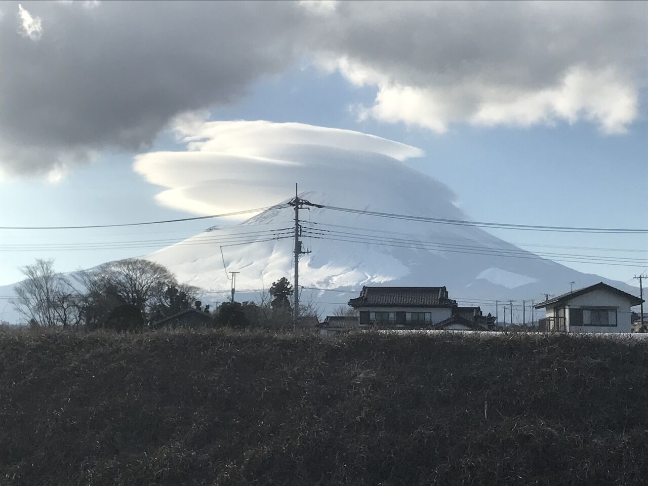 ある日の富士山、大きな傘雲が掛かっています。この後夜から、台風みたいな転機となりました。