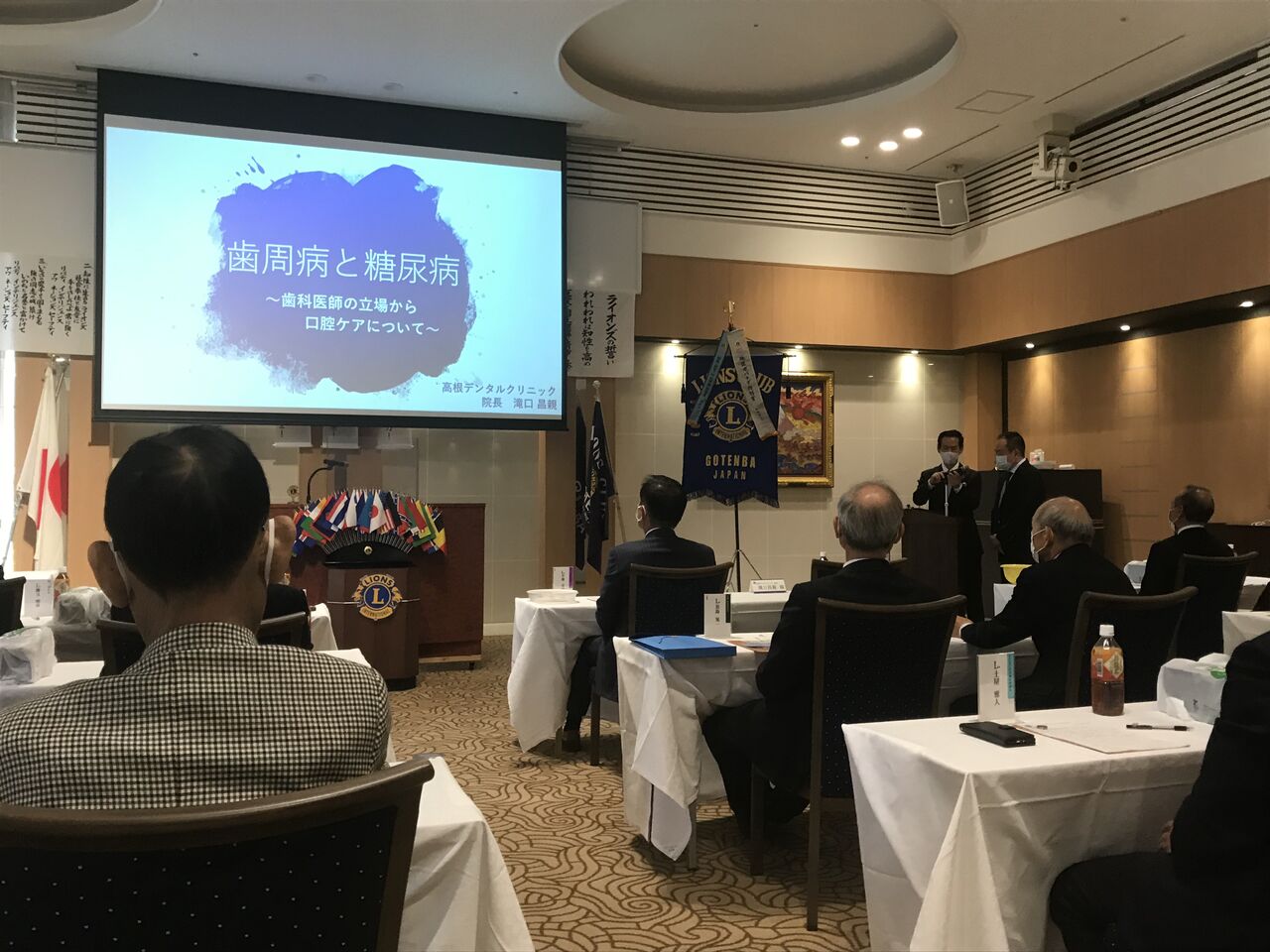 ライオンズクラブ4月第2例会、御殿場高原ホテル、根上会長、歯科医師 滝口君、「歯周病と糖尿病」、インプラント、お弁当、グラードン、ドーブル、ゴルゴ13