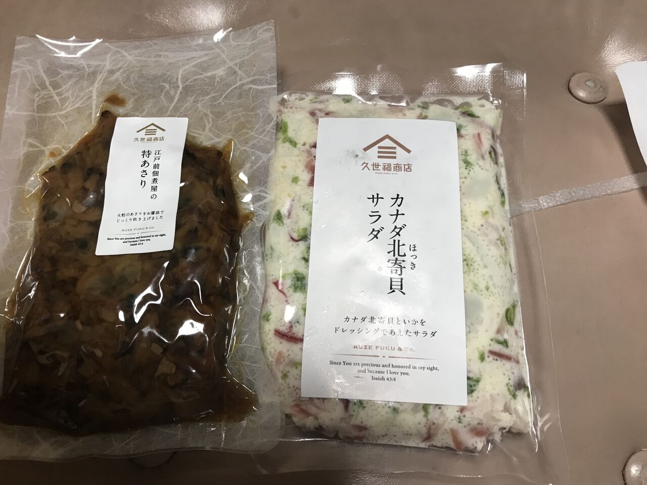 アサリの佃煮とカナダ 北寄貝サラダです。ペガサートでの会議の帰りに、セノバの地下で買いました。