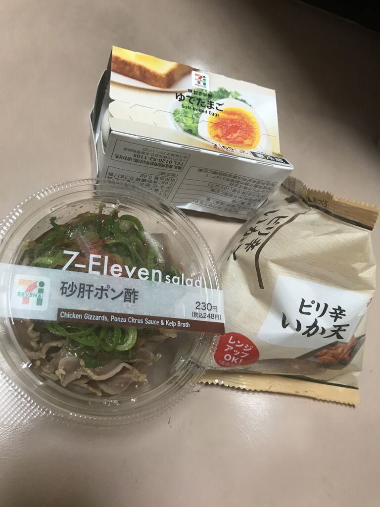 ゆで卵、砂肝ポン酢、ピリ辛イカ天。
