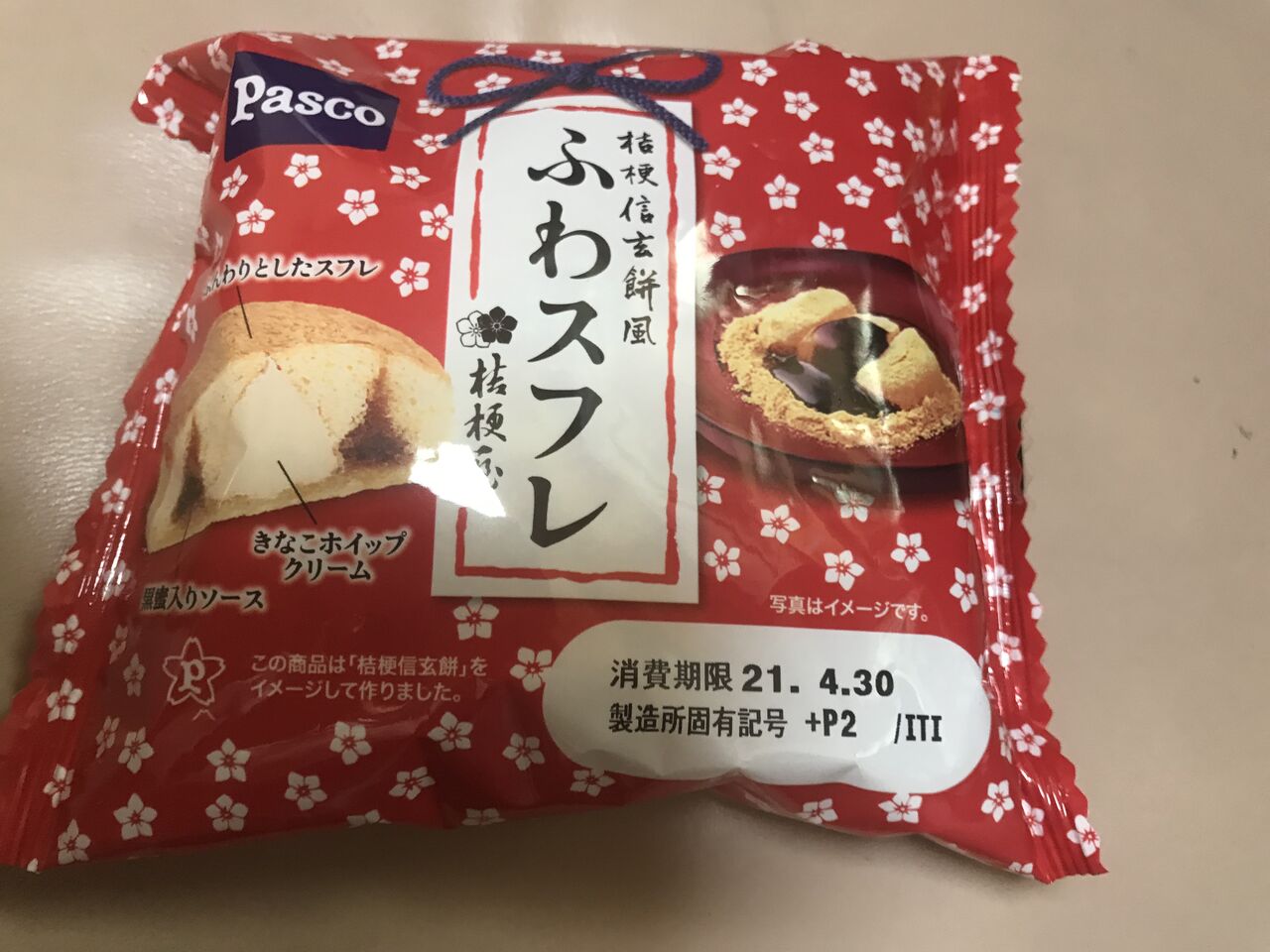 桔梗信玄餅風 ふわスフレ、前回買ったのは誰かに食べられてしまったため、再び購入。今回は食べれましたが、まあまあの美味しさというところでしょうかね。桔梗屋信玄餅感は、それほど感じられませんでした。