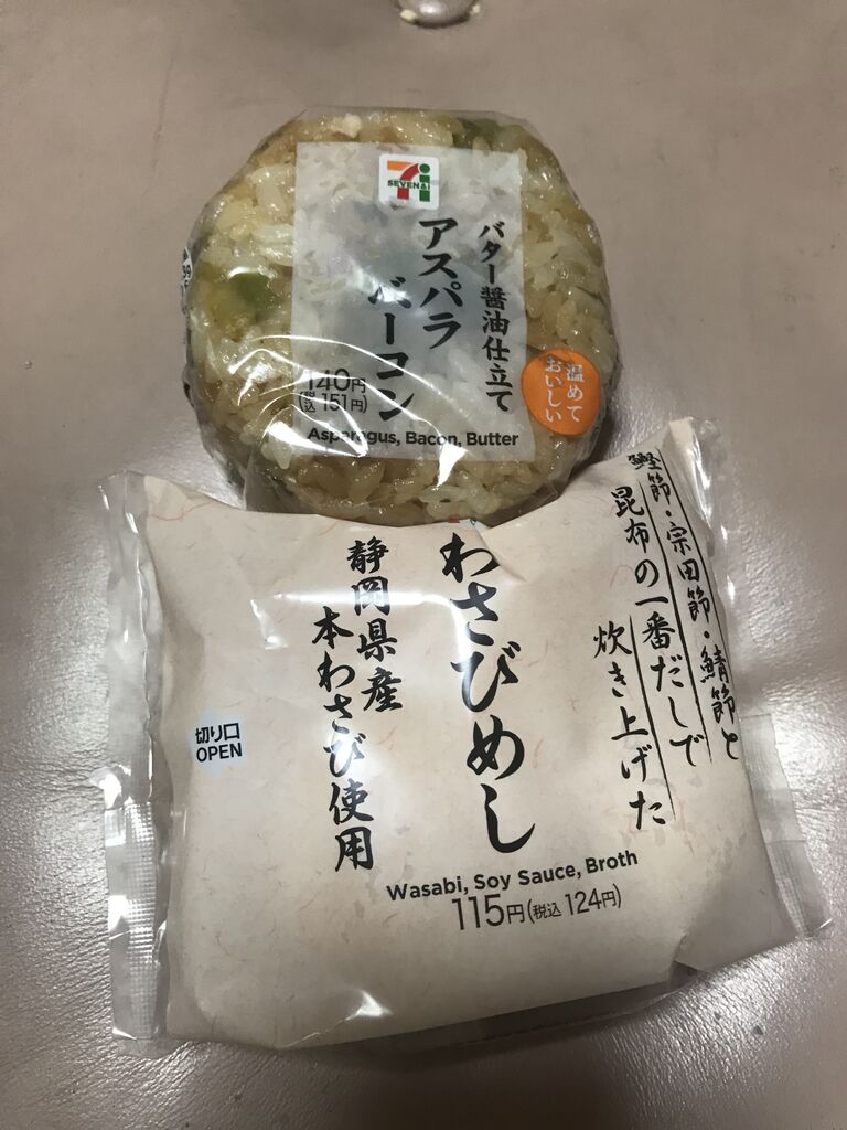 アスパラベーコン、わさびめしのお握り、まいうー!です。