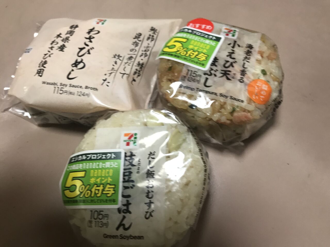 お握り3つ、わさびめし、小海老天まぶし、枝豆ごはん。