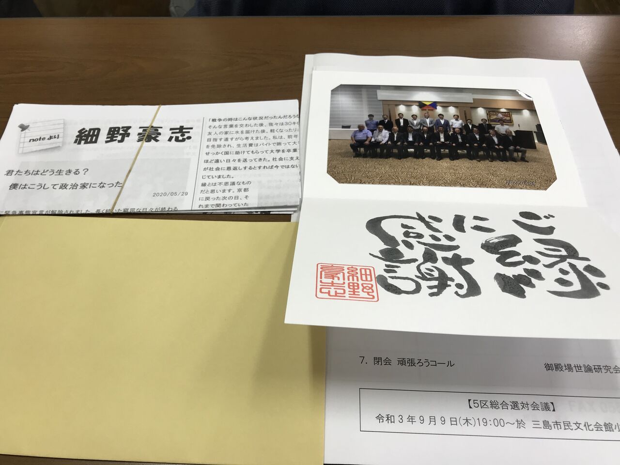 細野豪志衆議院議員後援会、御殿場市民会館、坪口選対本部長、「なか卯」親子丼 キツネ蕎麦、マリトッツォ ストロベリー&ラズベリーソース仕立て、常備品アイス、夜食、砂肝ポン酢