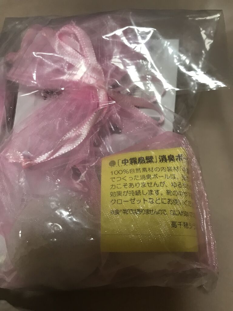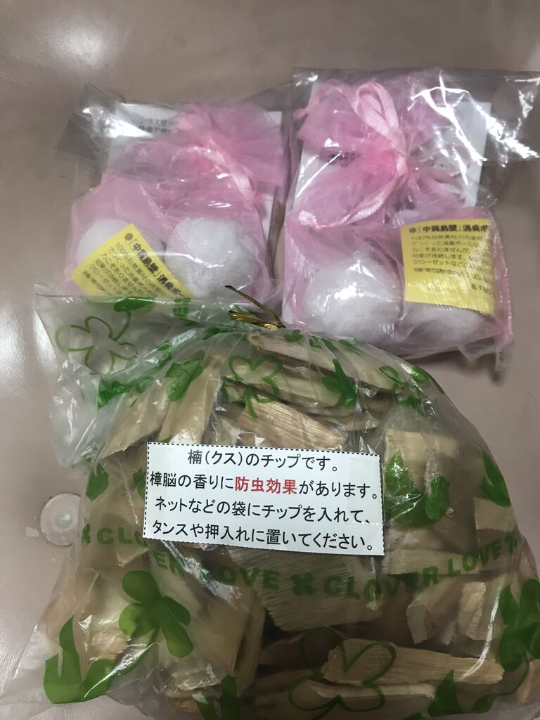 「ナガイ」さんに、お土産いただきました。虫よけ効果のある楠のチップと内・外装の壁に使われていた、中霧島壁で出来た消臭ボール。