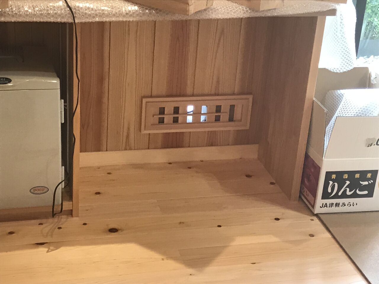 木製ガラリの付いた吸気口。右は、居間からキッチン方向を撮影。