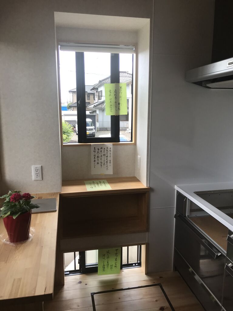 キッチン内2段窓。換気と足元の涼風に役立ちます。もちろん採光も。