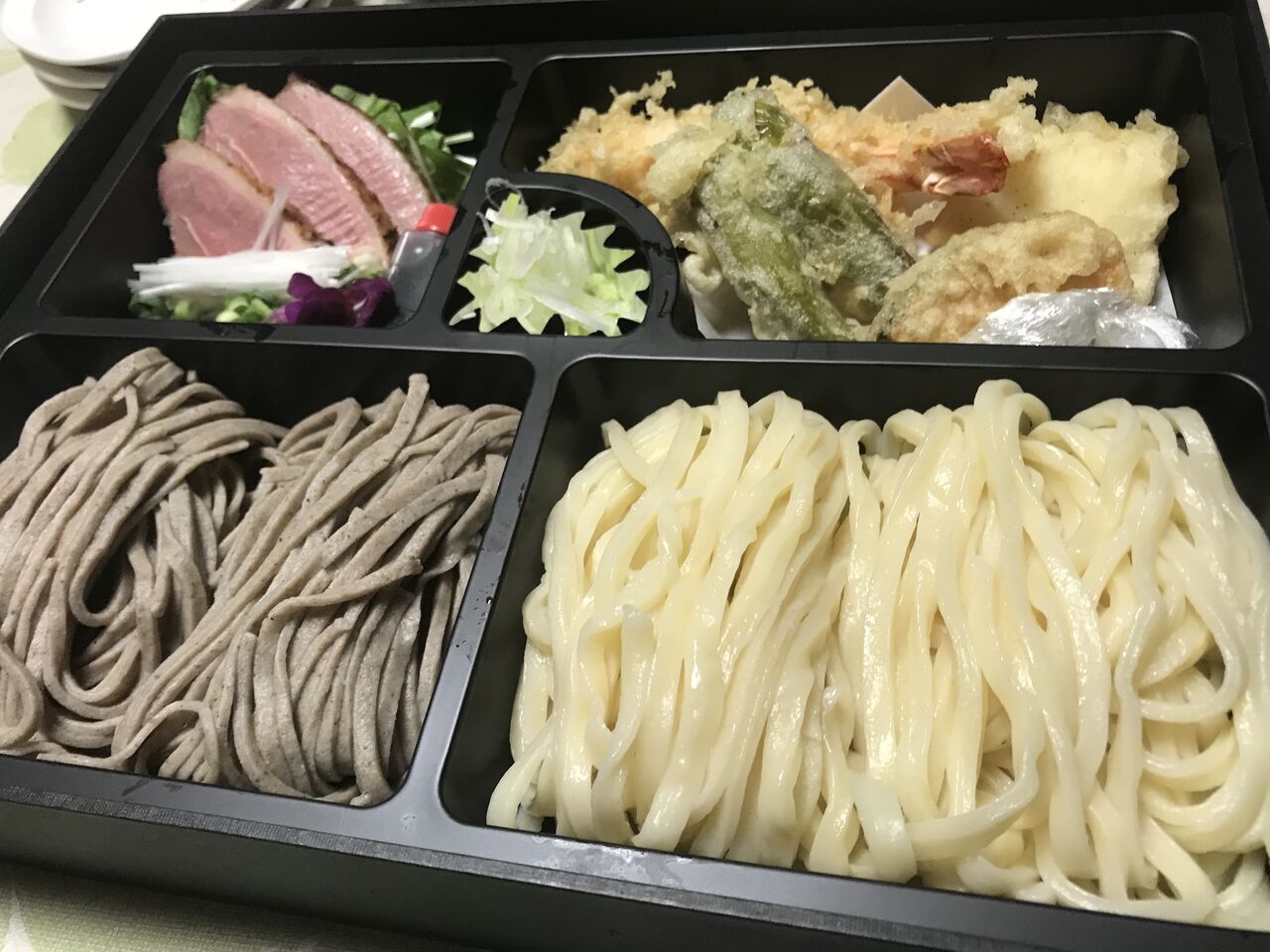 食事も、お弁当持ち帰りです。蕎麦もうどんも鴨も天婦羅も、まいうー!