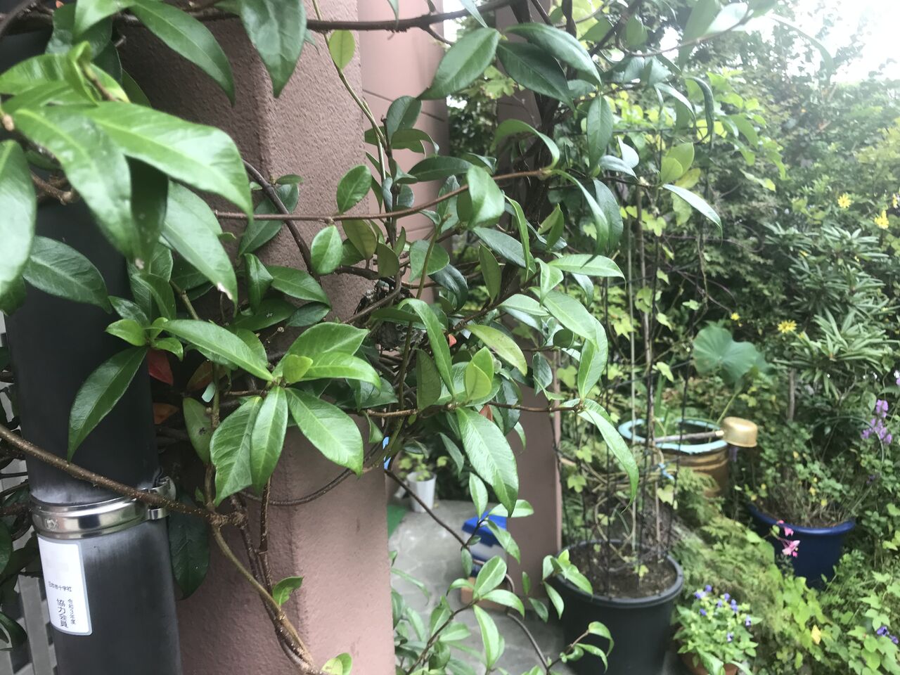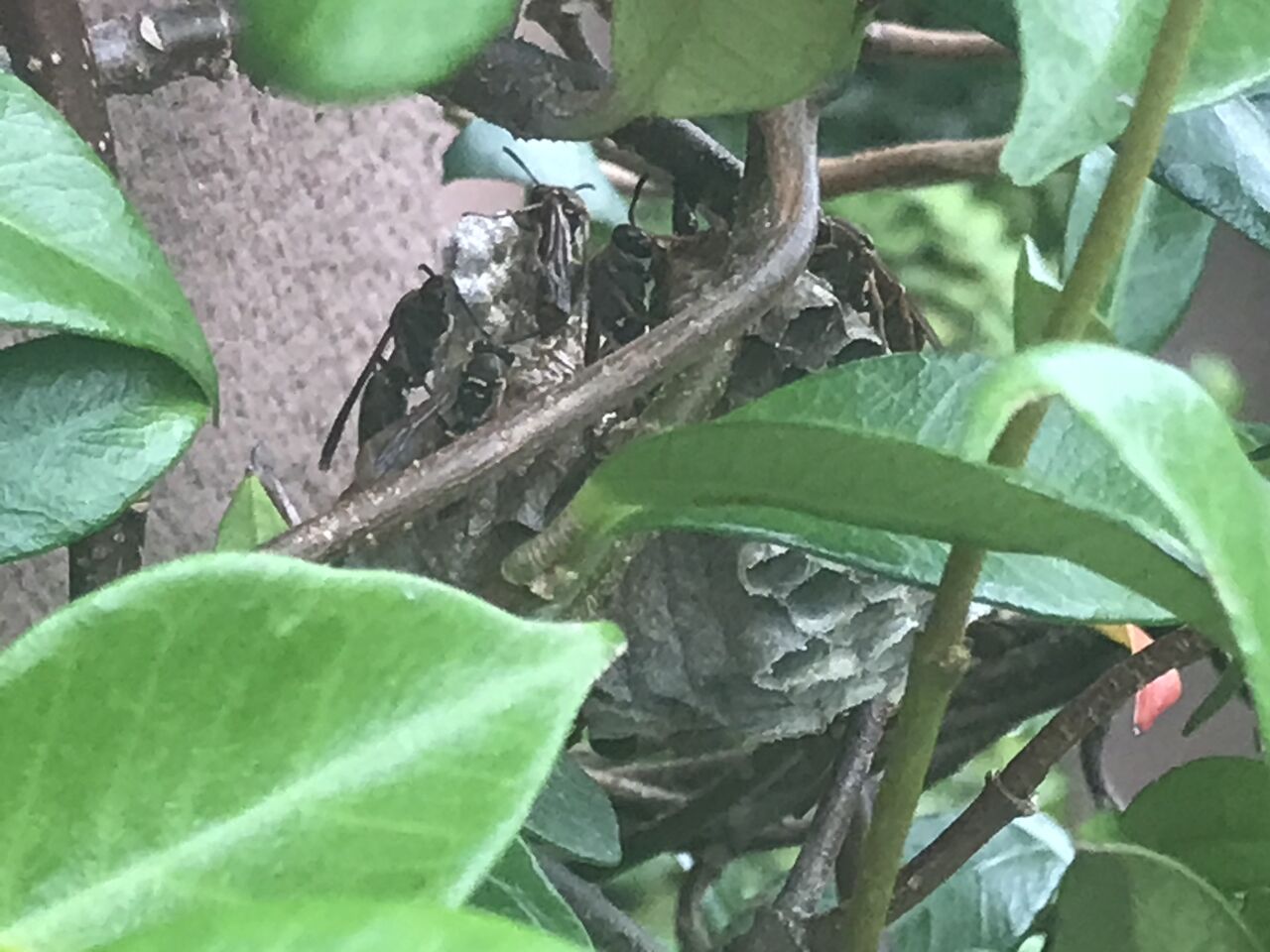 自宅の玄関前の柱に絡みついたパッションフルーツの蔦に、地蜂が巣を作っています。