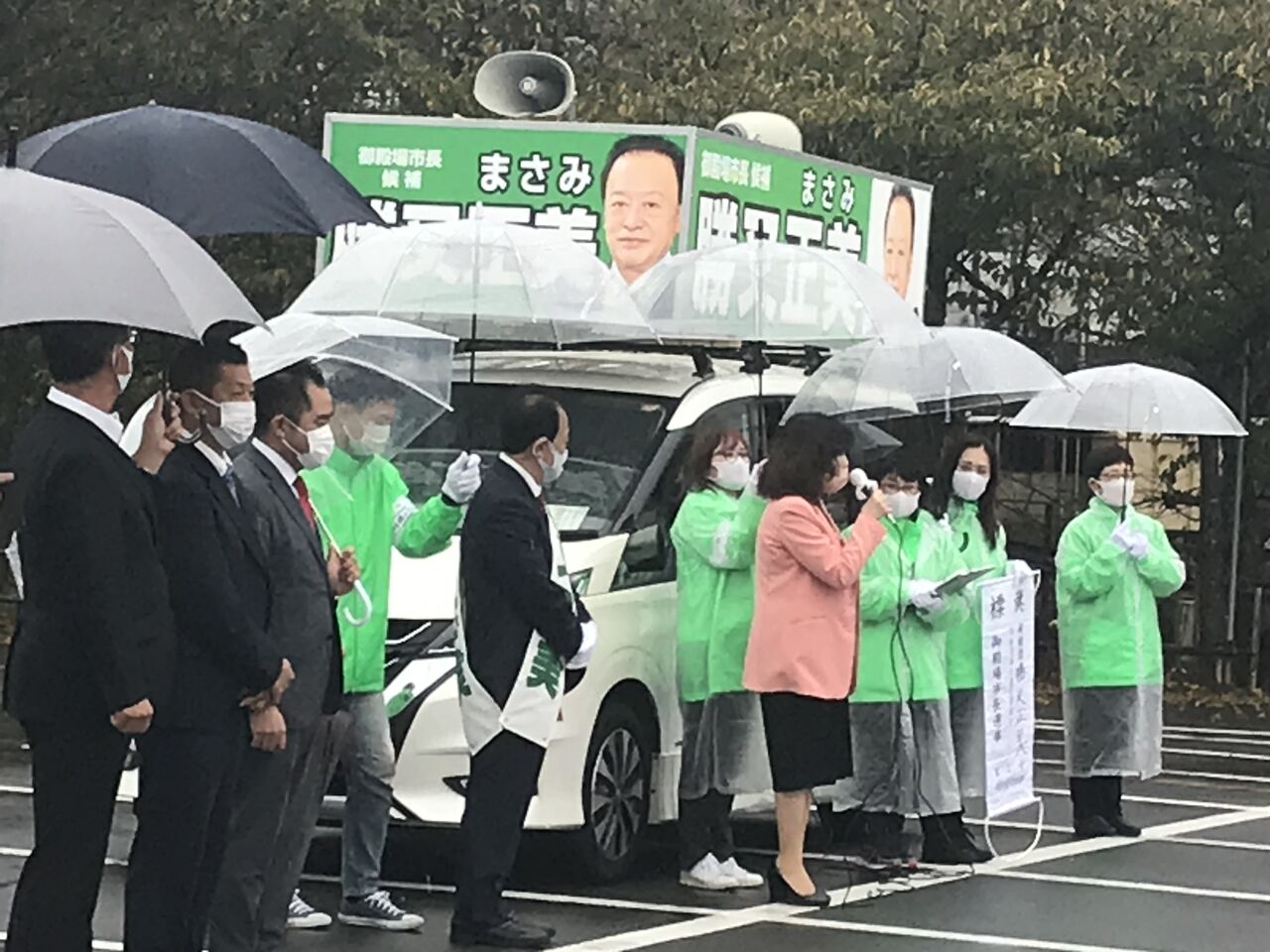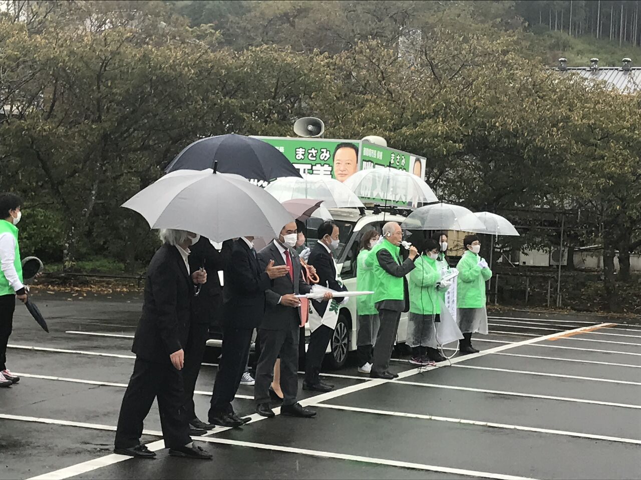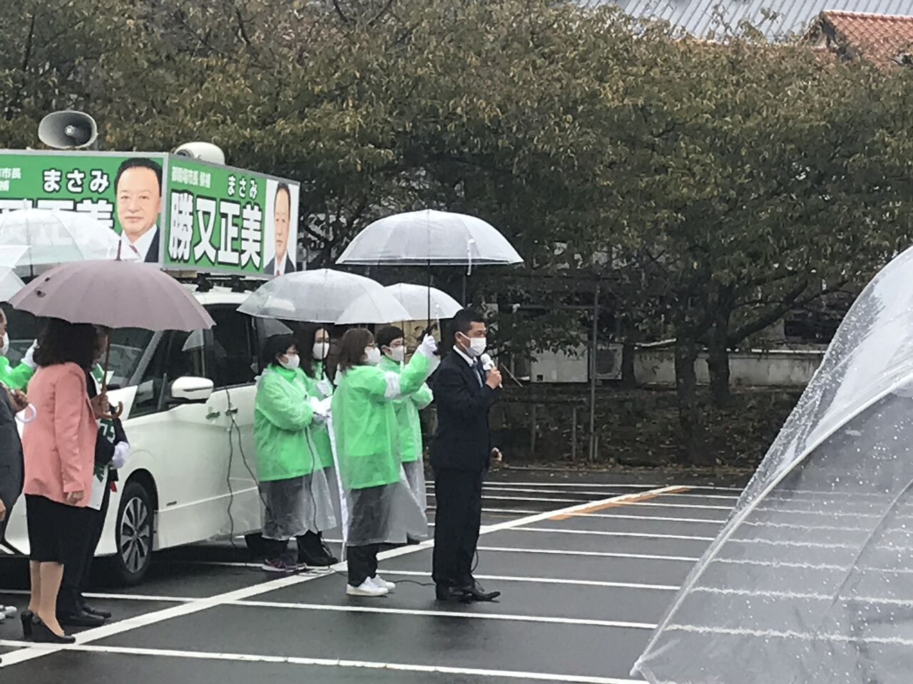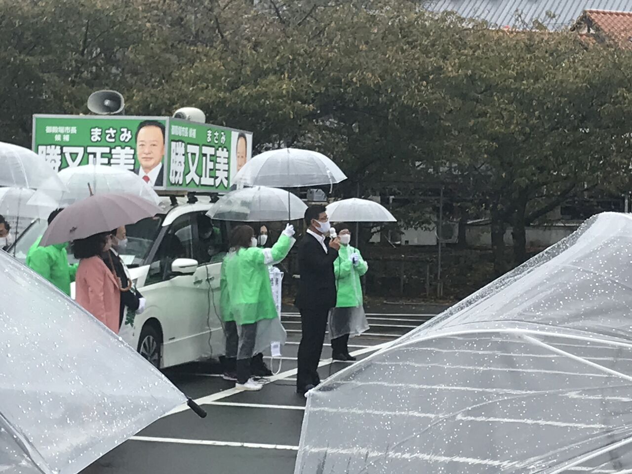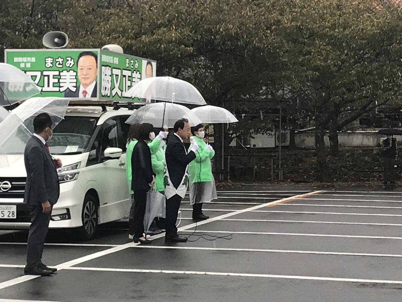 これは先日終了した、御殿場市長選挙の時の勝又正美候補の分散出陣式の模様です。コロナの為に出陣式を各地を回り行いました。