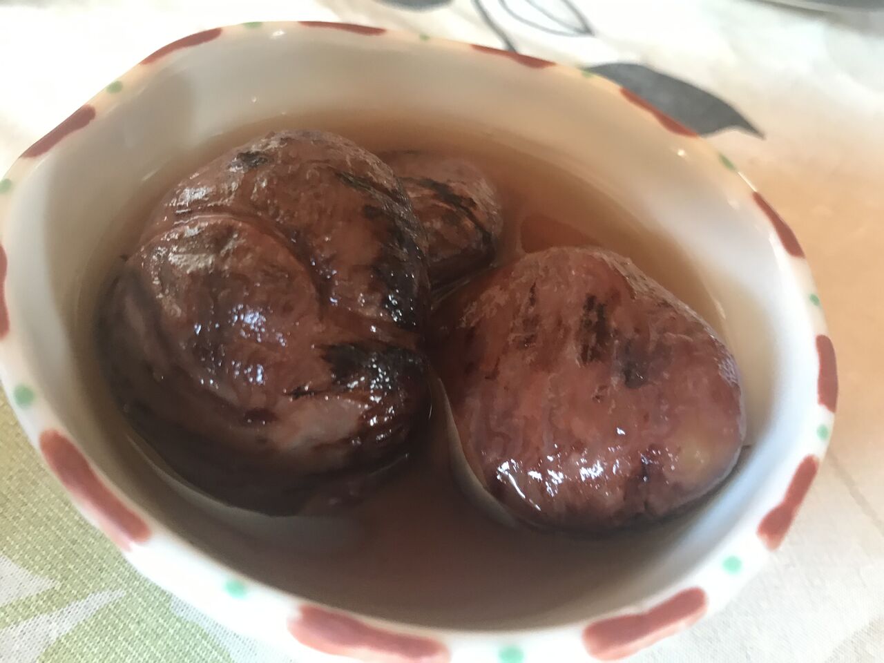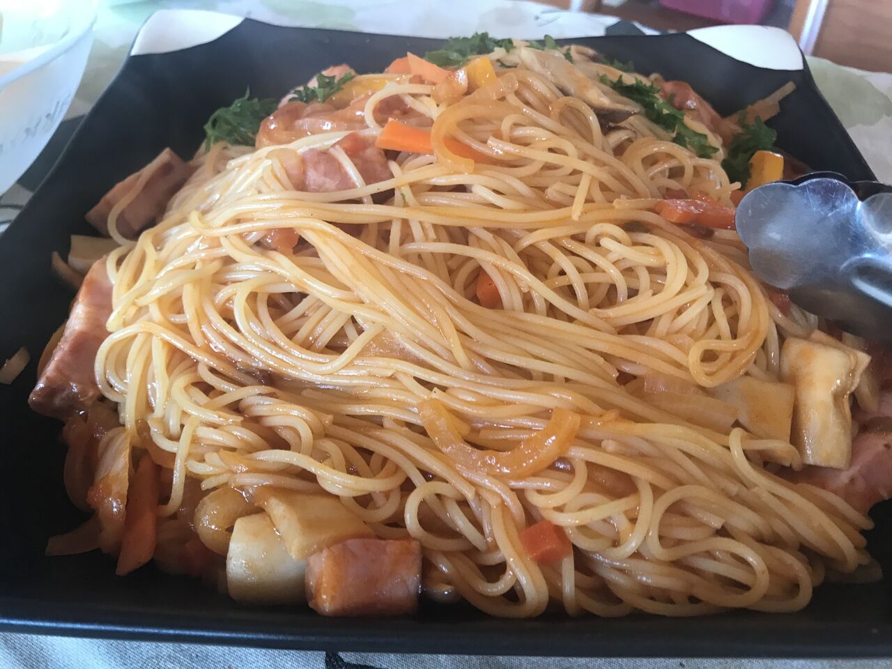 ある日の昼食、妻が作ったスパゲッティと栗の渋皮煮です。