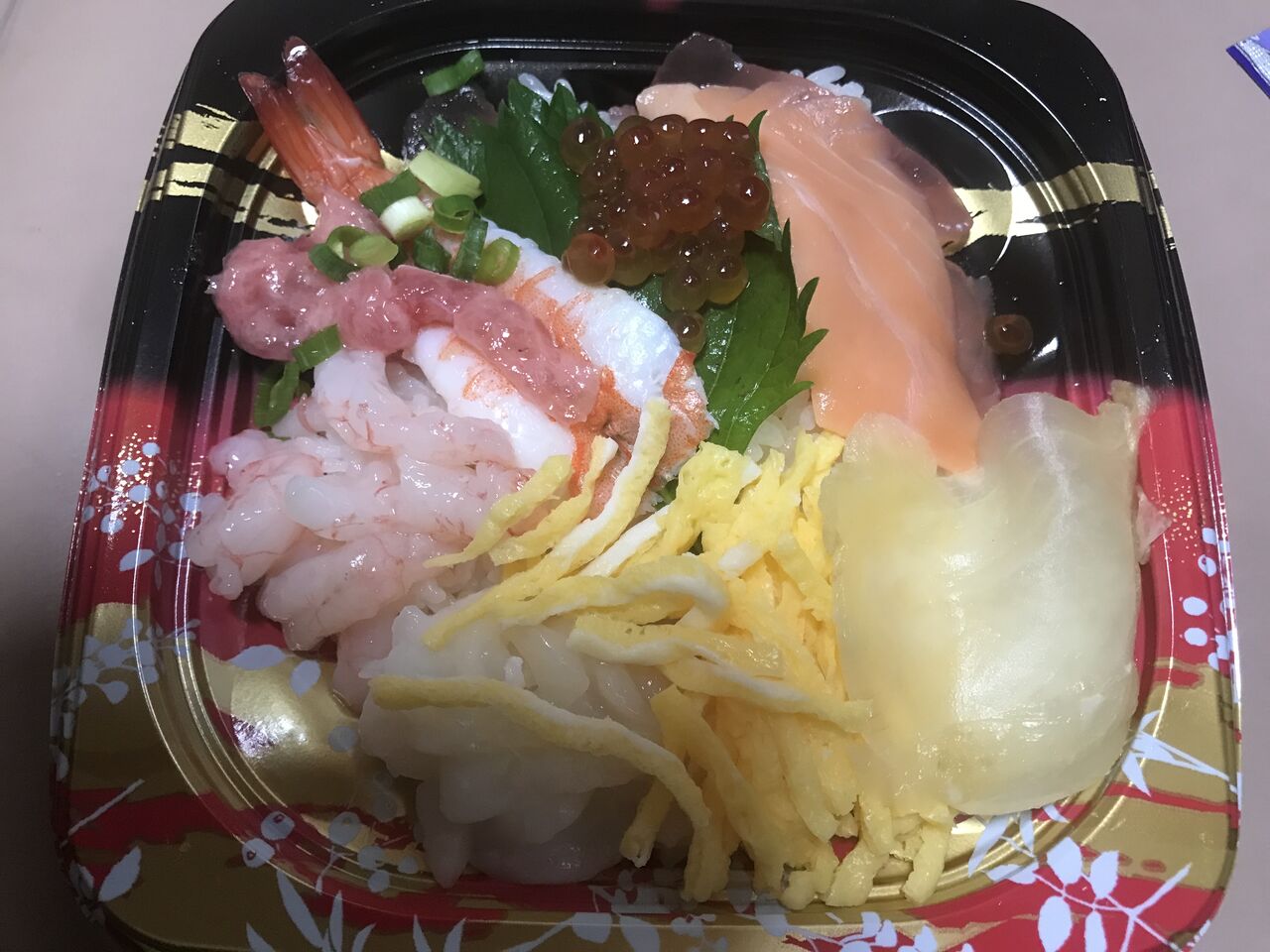 ある休日出勤時の朝ごはんです。マックスバリュ大吉寿司のチラシ寿司と五つ星鶏ももから揚げ。
