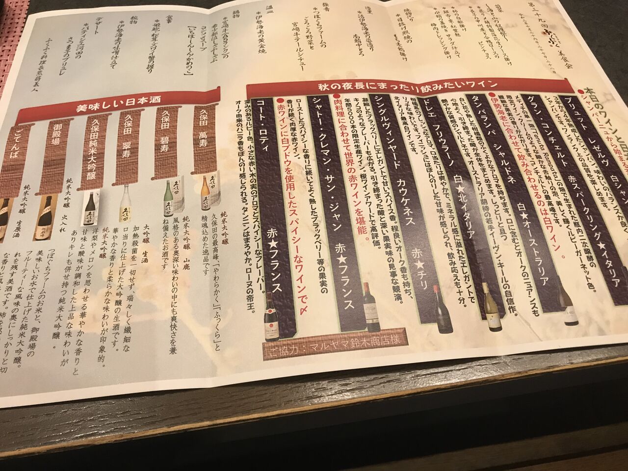 メニューと飲み物リスト。今日は、スパークリングワインが多いですね。
