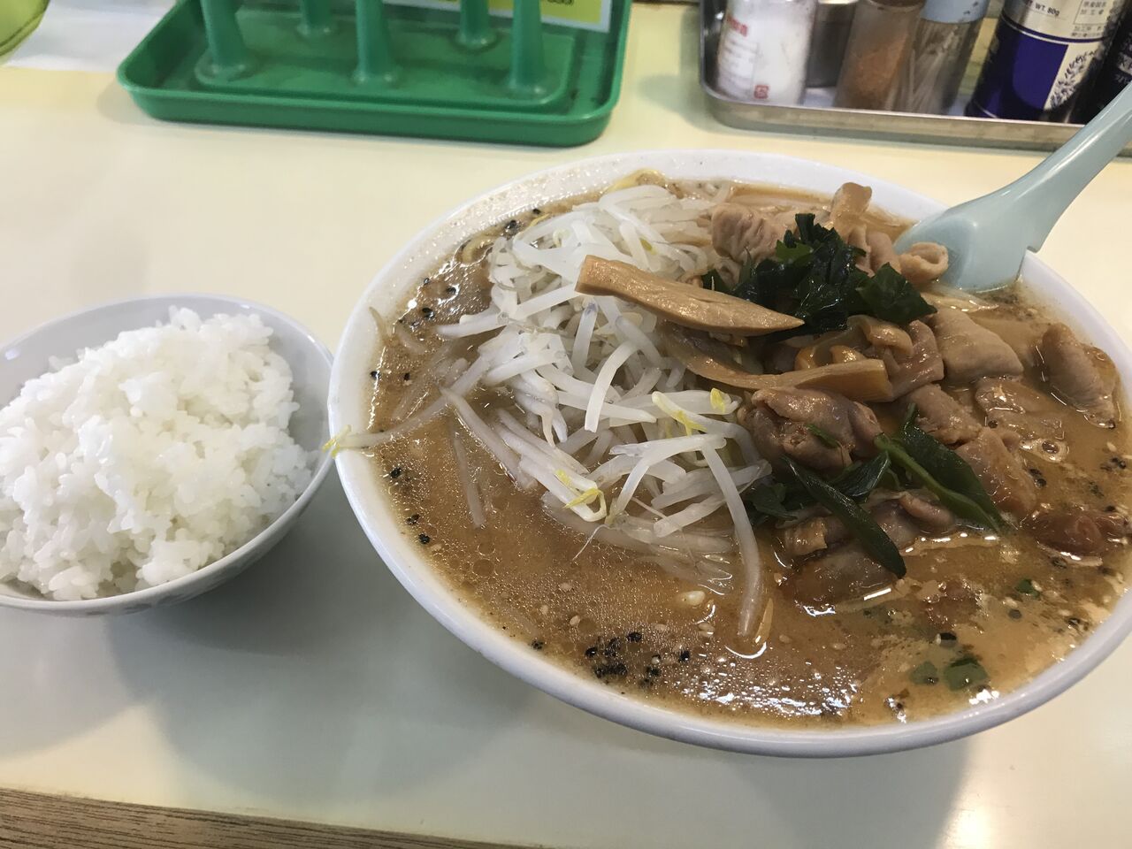 裾野「雪の子」もつ煮ラーメン大盛、サービス小ライス。
