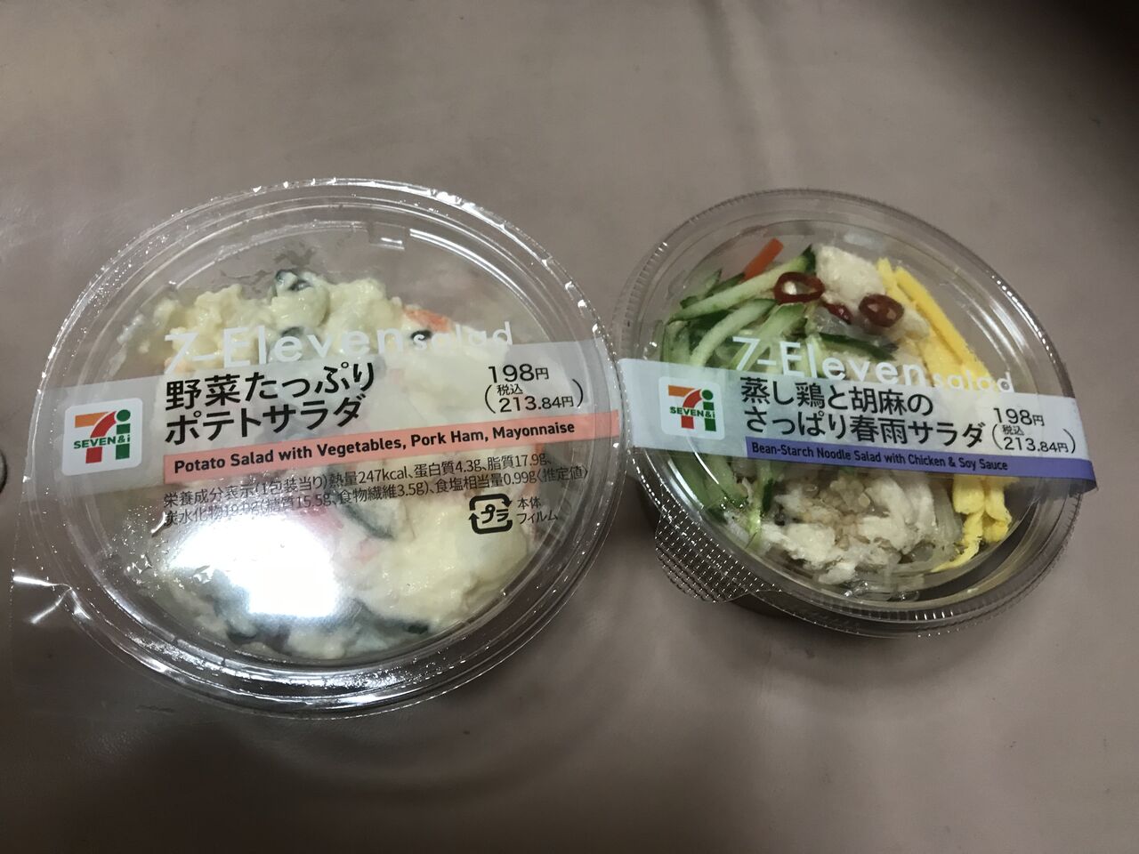 セブンイレブン、野菜たっぷりポテトサラダ、蒸し鶏と胡麻のさっぱり春雨サラダ。
