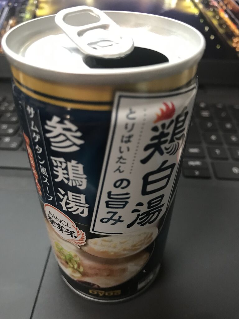 最近はこんな缶飲料も自販機で売ってます。鶏白湯の旨み「サムゲタン風スープ」まいうー!