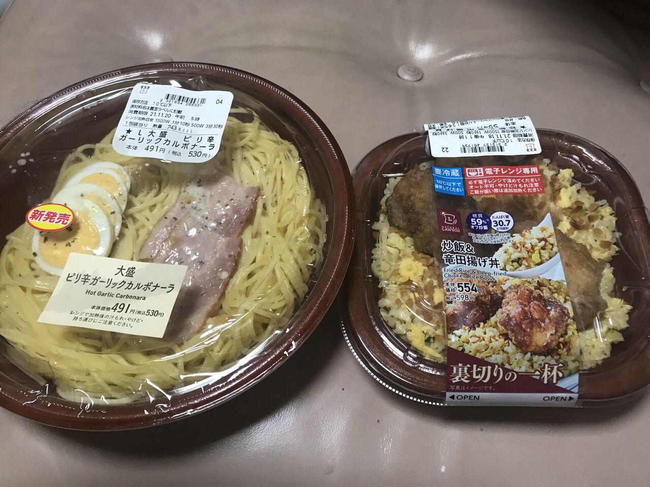 ある休日の昼ご飯です!カルボナーラとチャーハン竜田揚丼です。