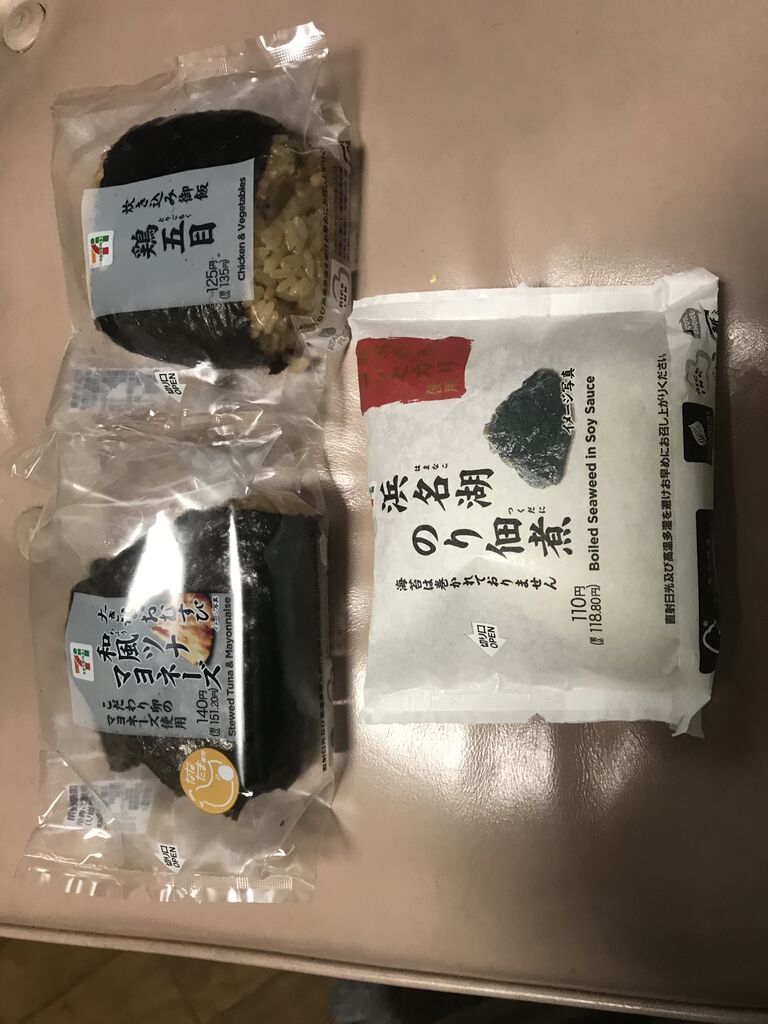 帰りにコンビニでお握りを買い、家で遅い朝食です。
