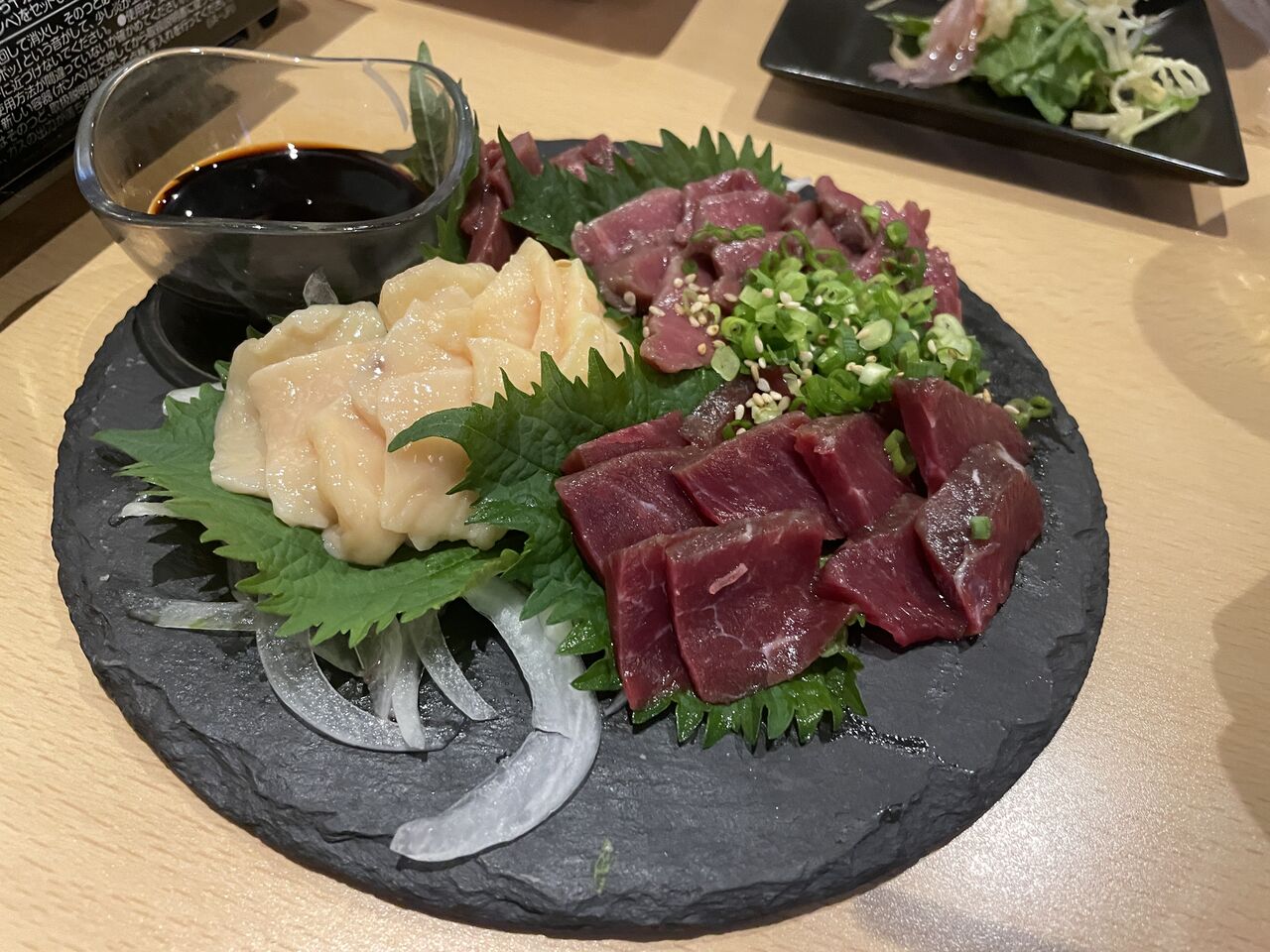 某所 鉄骨外階段修繕工事、枇杷、花、芹沢前商工会副会長 御苦労さん会、富士溶岩石居酒屋 「頂」、馬刺し、もつ鍋、ハムカツ、スパム、浅利、焼肉