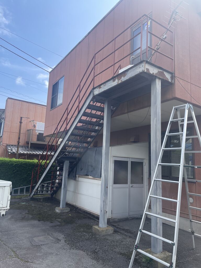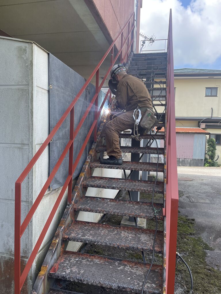 某所、鉄骨外階段修繕工事。腐食してしまった手摺等を撤去後、新しい手摺等を溶接設置中です。