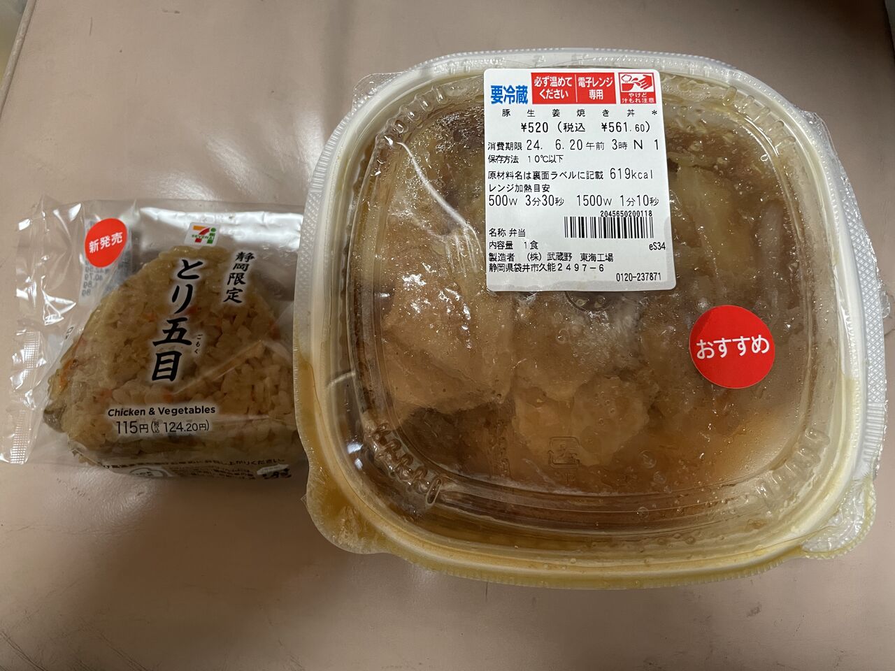 ある日の昼食。豚生姜焼き丼と、とり五目お握り。