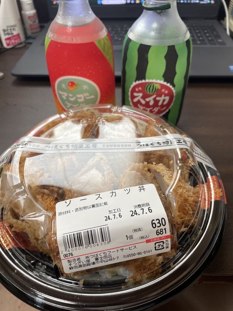 ある日の昼食は「そうざい屋」さんのソースカツ丼と、マンゴー・スイカ炭酸ジュース。