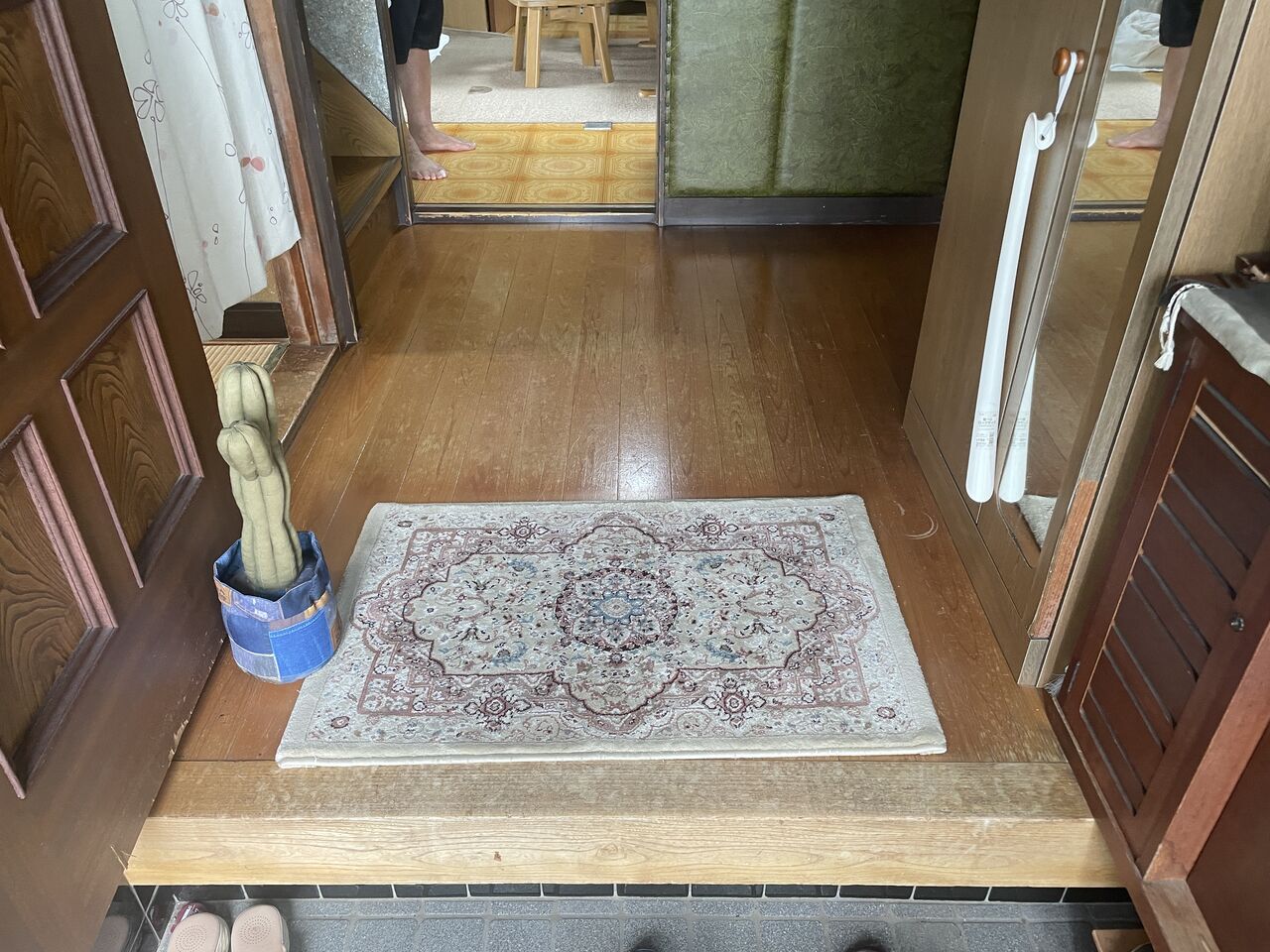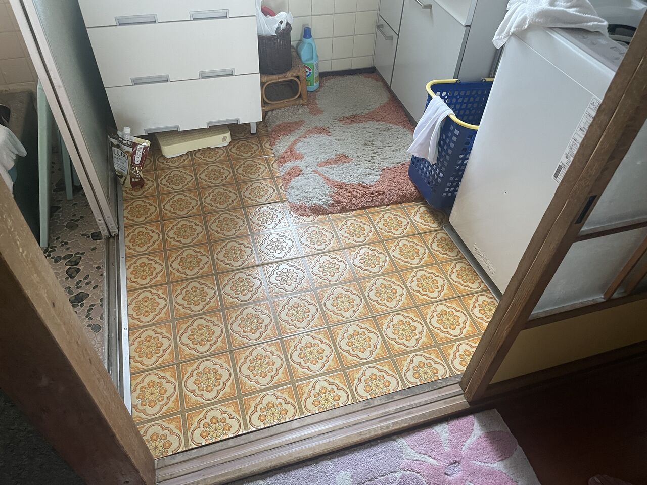 某所、玄関ホールと洗面所床板が古くなり腰が抜けてしまい、上るとプカプカするので、玄関ホールはフローリングを上から貼り、洗面所は床を貼替えてCFシート(クッションフロア)を張る予定です。