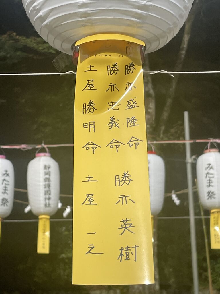 2人の名前と私の名前が、提灯に提げられています。