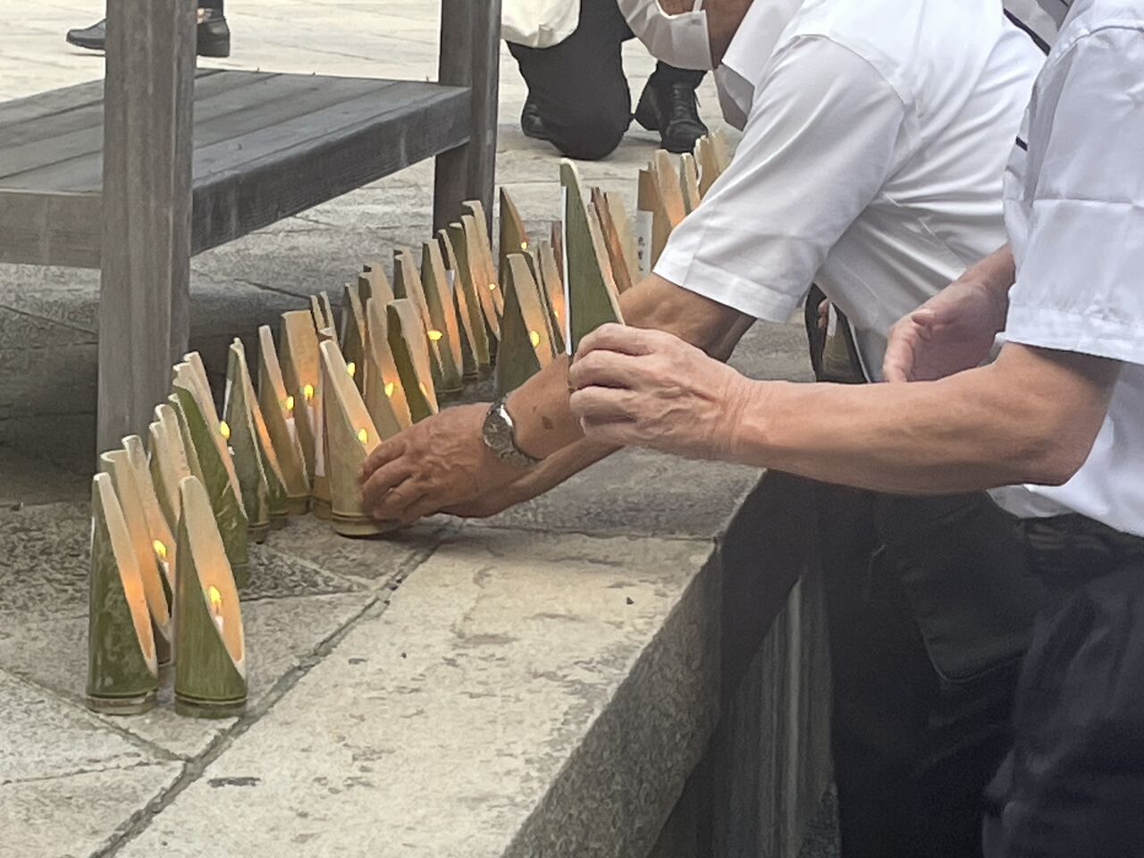 日が暮れる頃、竹に入れた蝋燭に点火して、神殿前に捧げます。