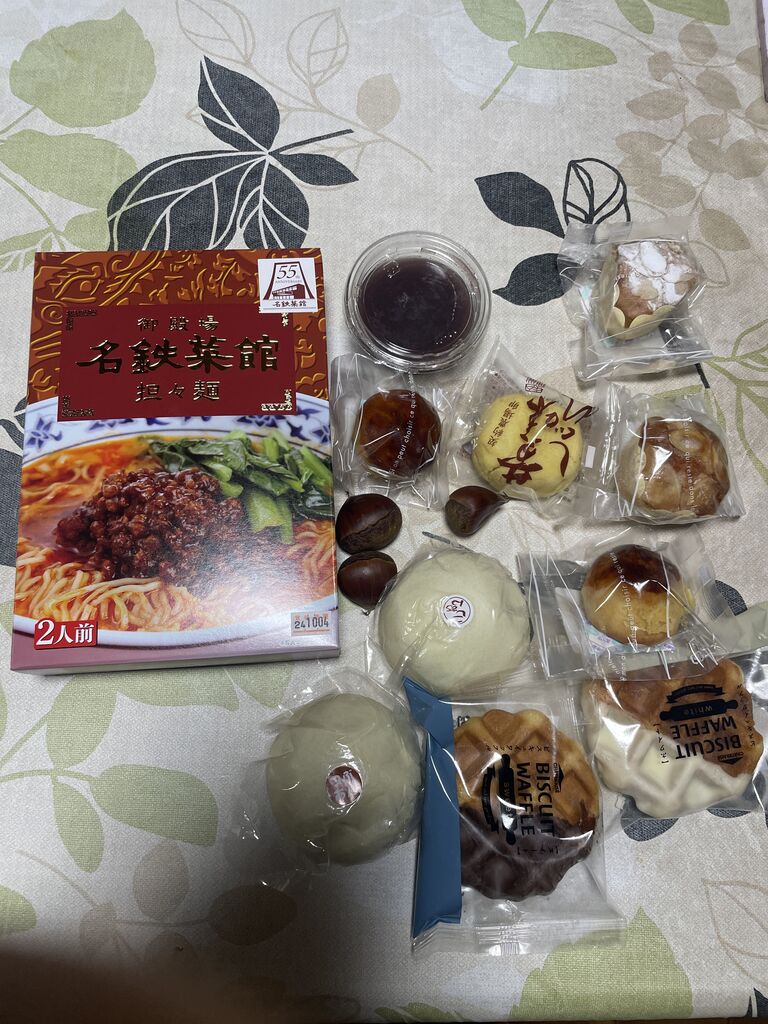 担々麺は、クイズに出た参加賞。その他は、お土産に持ち帰ったお供えの戦利品。