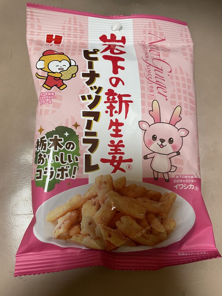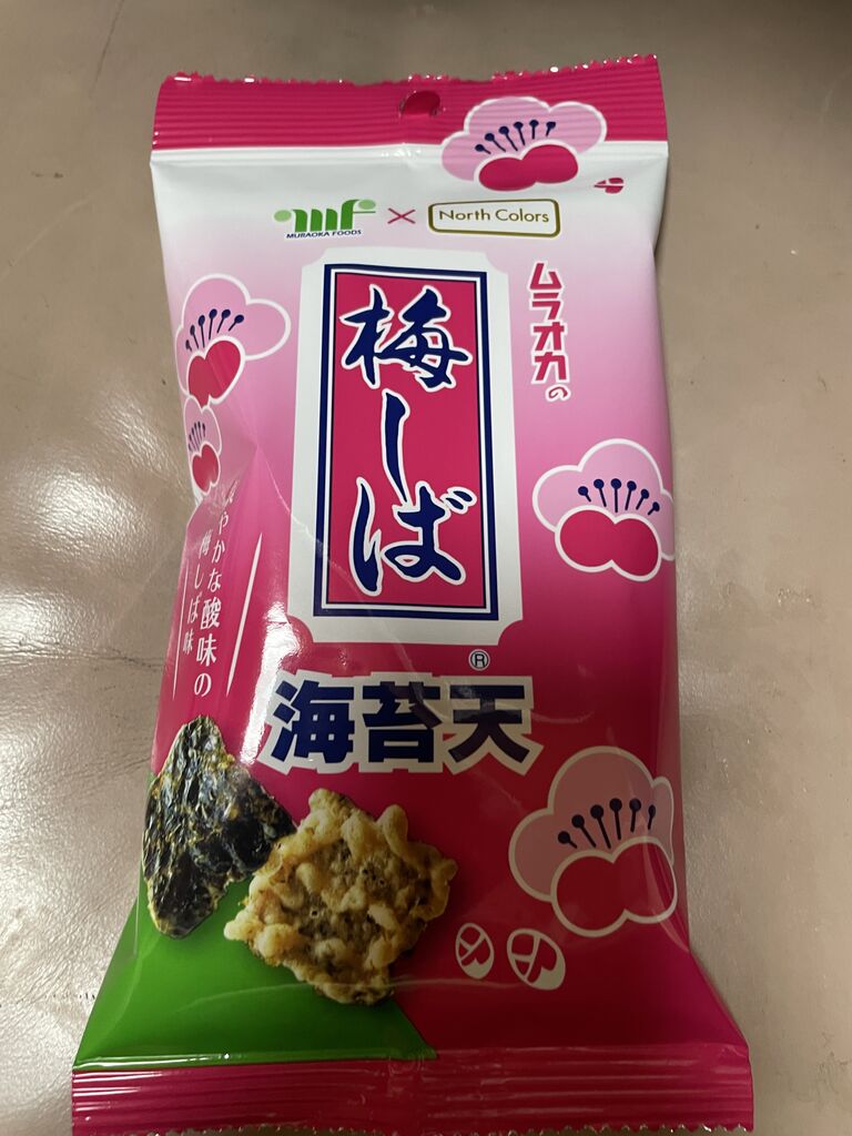 梅しば海苔天と岩下の新生姜ピーナッツアラレ。