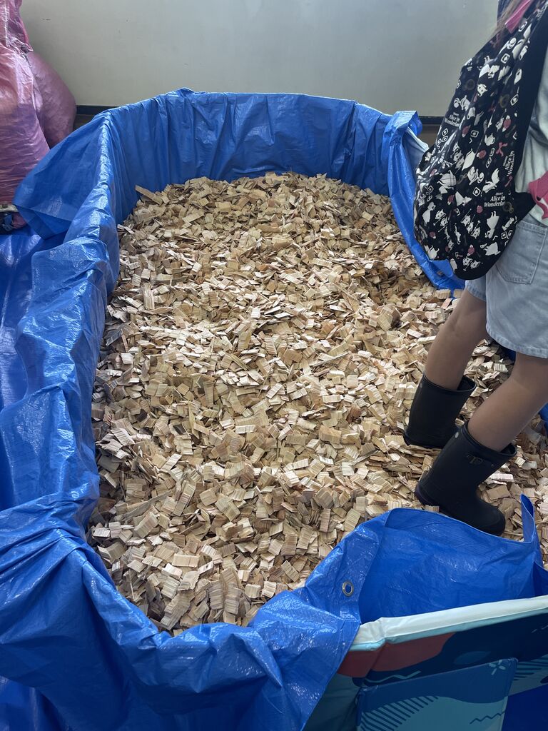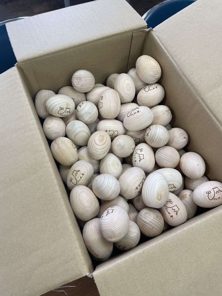 木材協同組合のブースは3階。木の卵にウッドチップ。