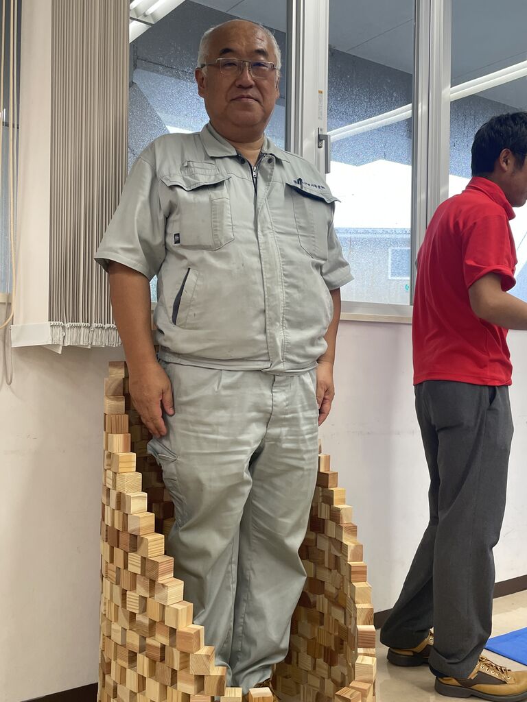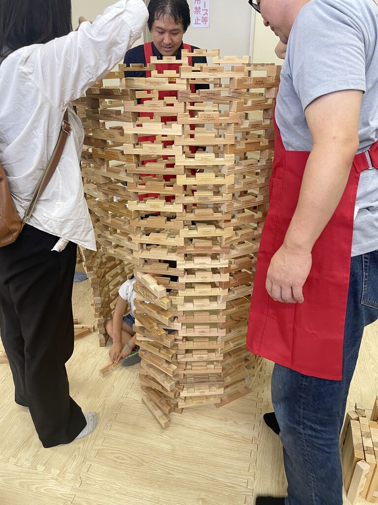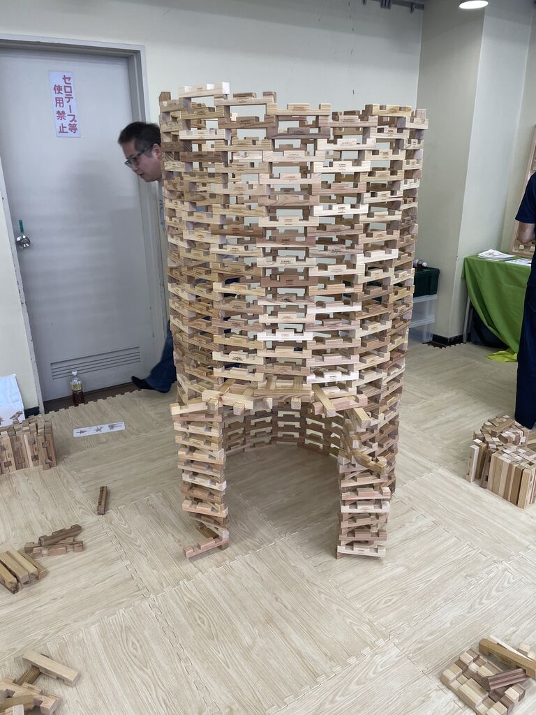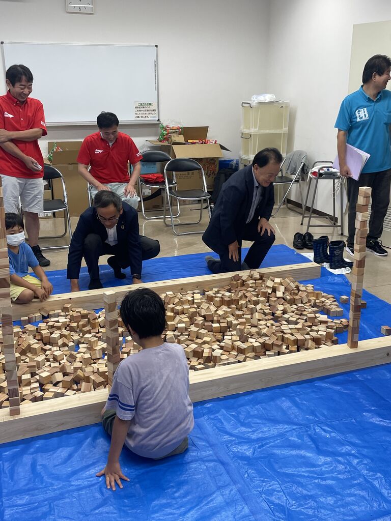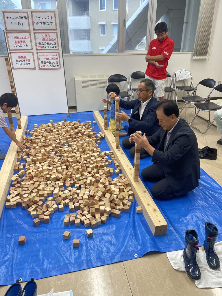 こちらは、商工会建設部会。積み木タワーチャレンジ。市長と副市長がチャレンジ中。