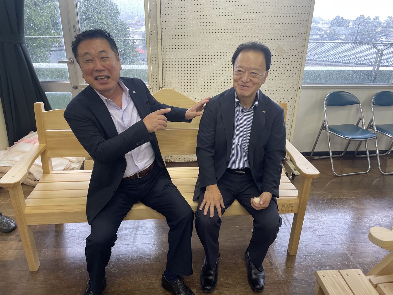 小寺製材さんが作った、テーブルから椅子にも変わる椅子に座ってます。