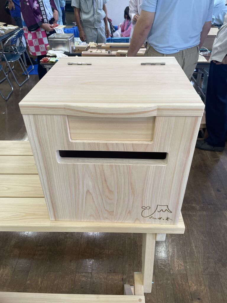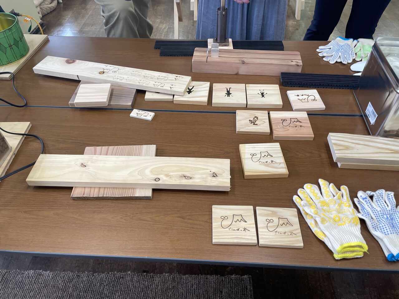 木の板に焼き印を付けるコーナーと市役所発注の木の書類受け。
