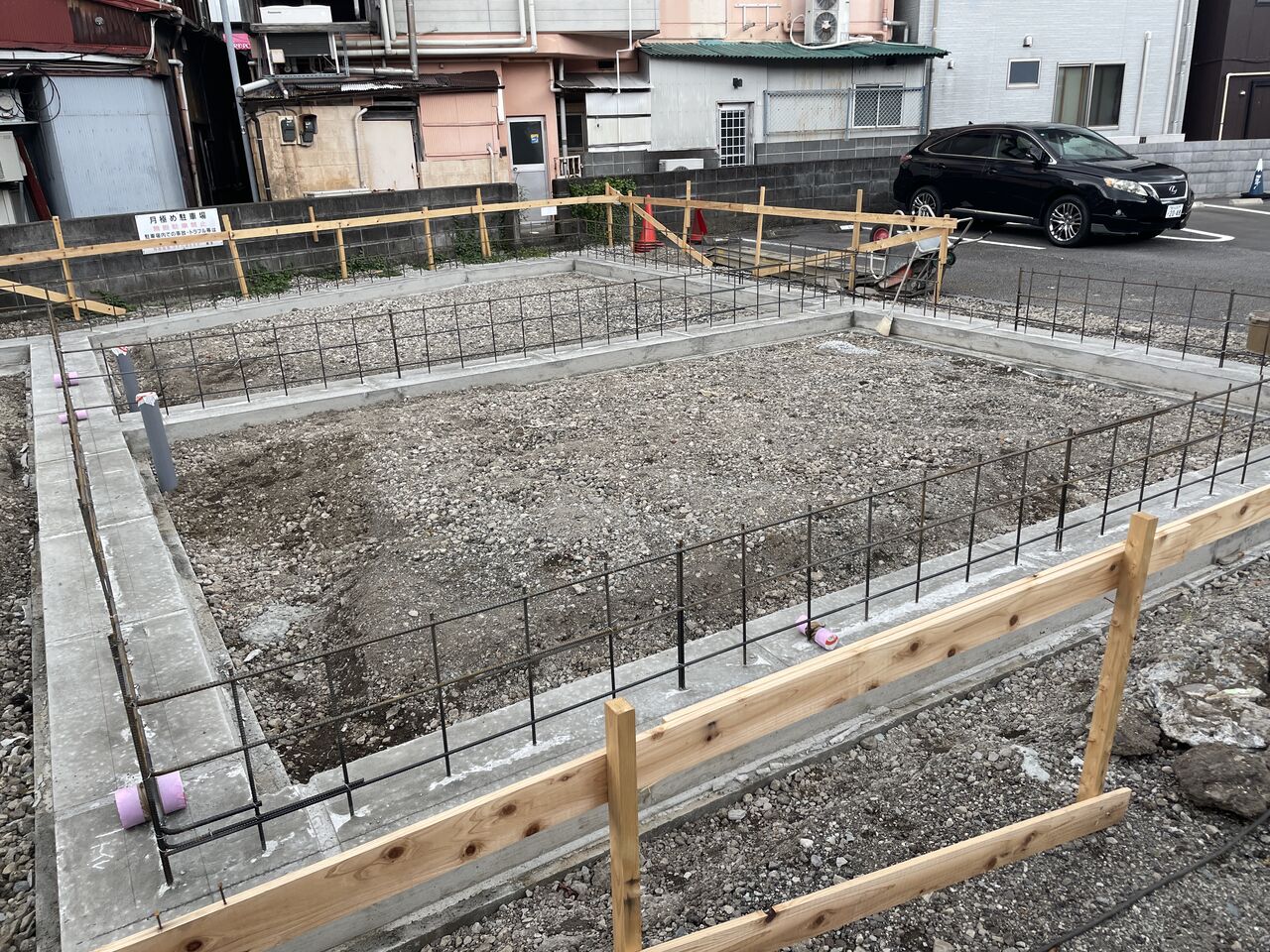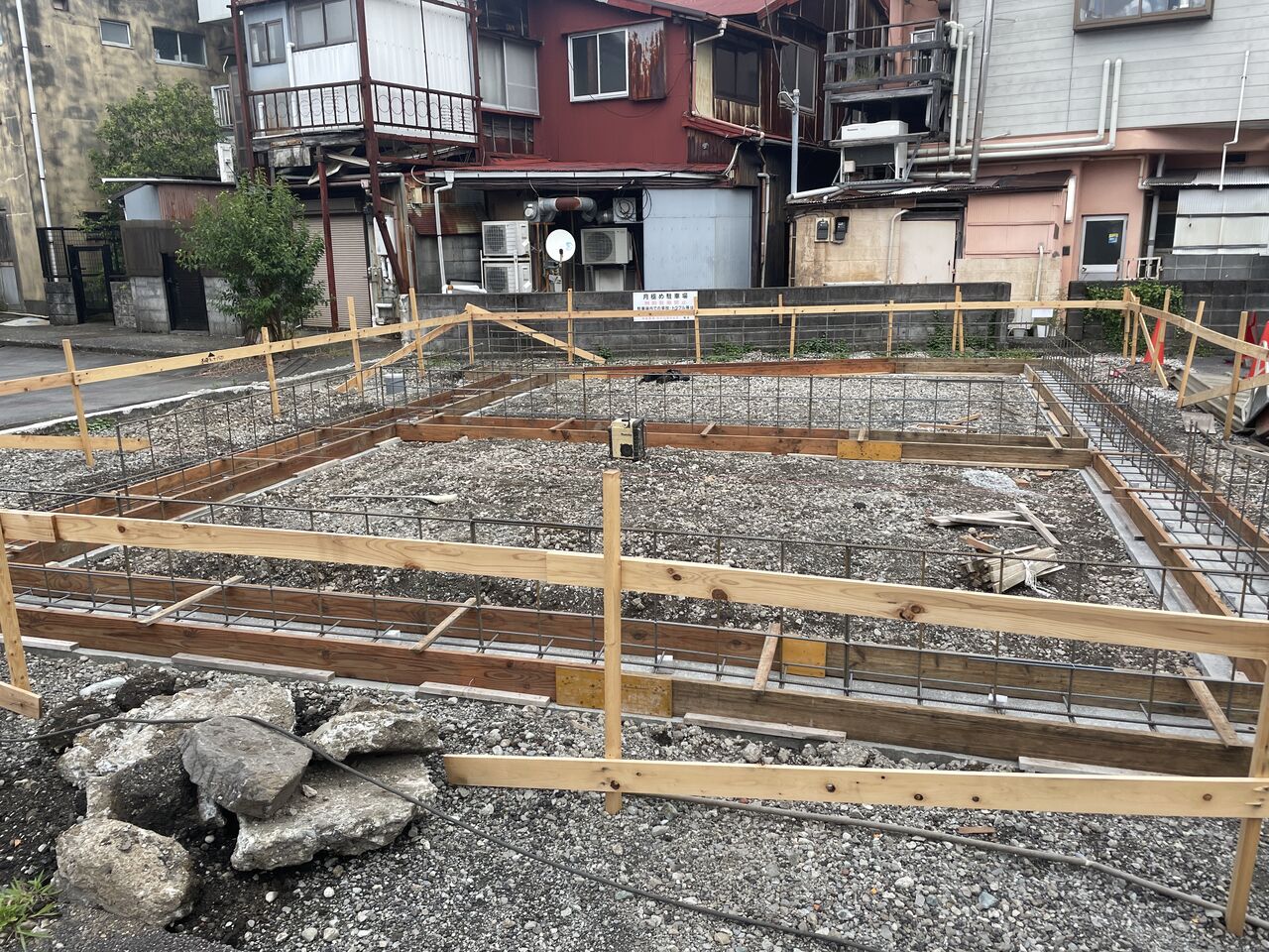 某所、貸店舗基礎 均しコンクリート打設完了。配筋・底版型枠組完了。