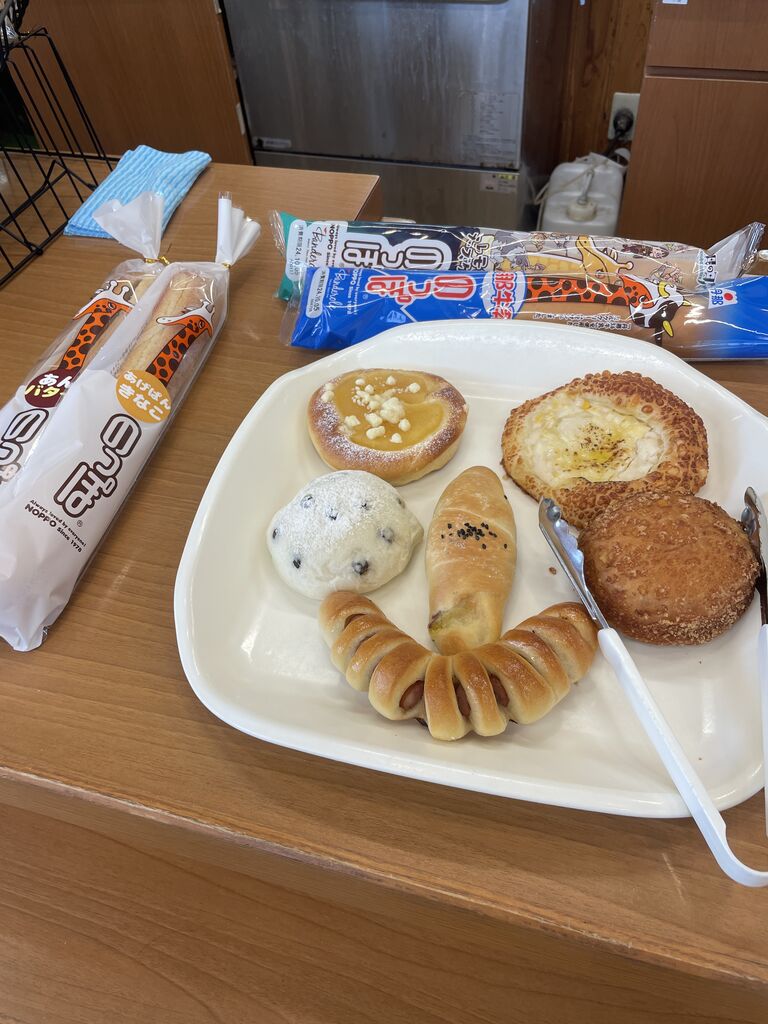 「雪の子」味噌ラーメン&餃子ライスセット、のっぽベーカリー、GEOのお菓子、おやつカルパス、SALTYバター、オールレーズン、ガトーレーズン、サービスショット!
