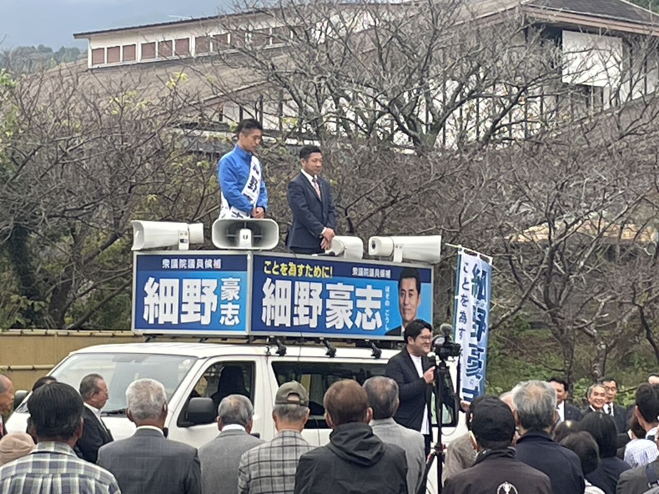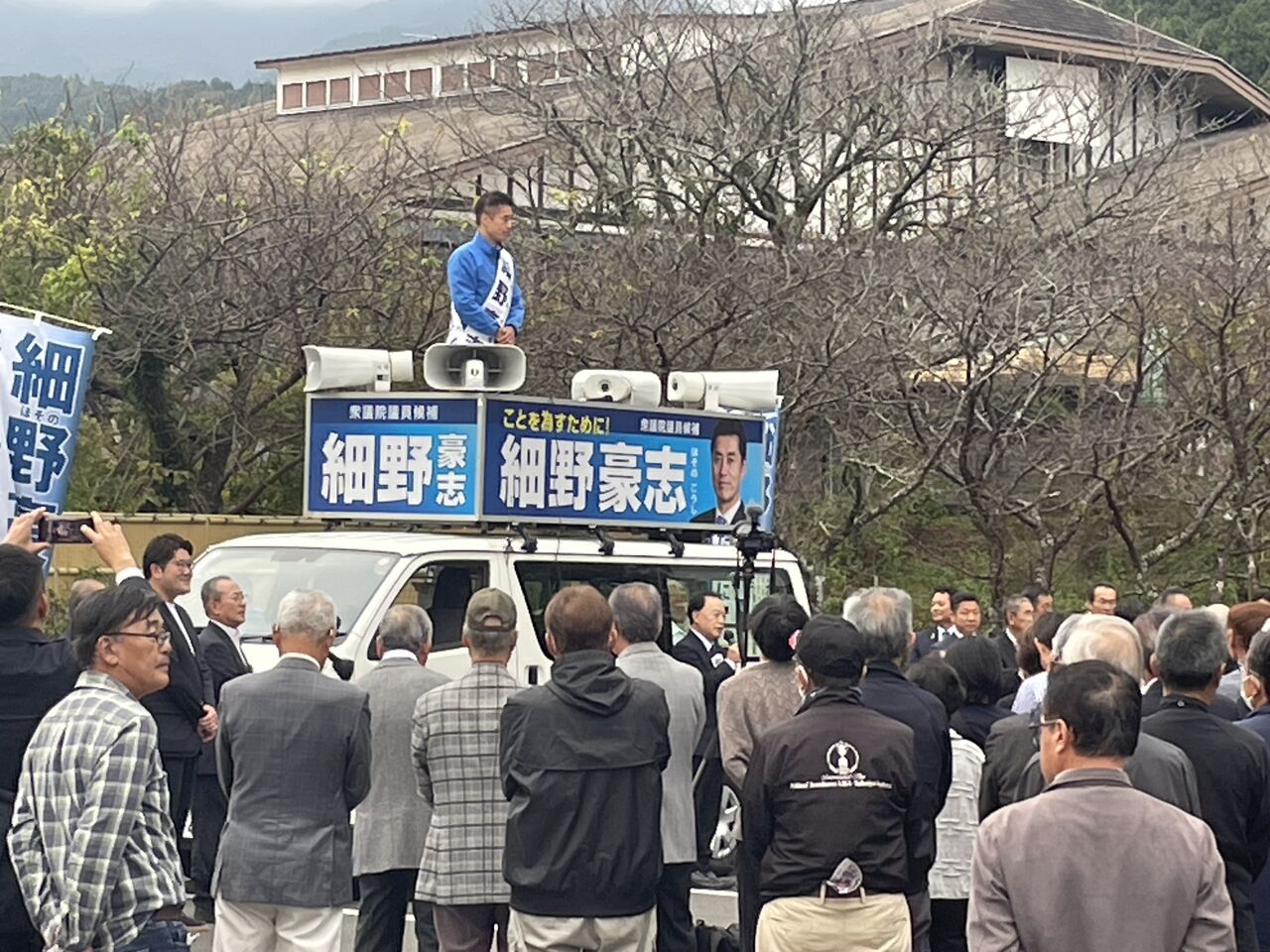 この日は衆議院銀選挙最終日。高原ホテル駐車場で細野豪志衆議院議員の最後の立会演説会でした。