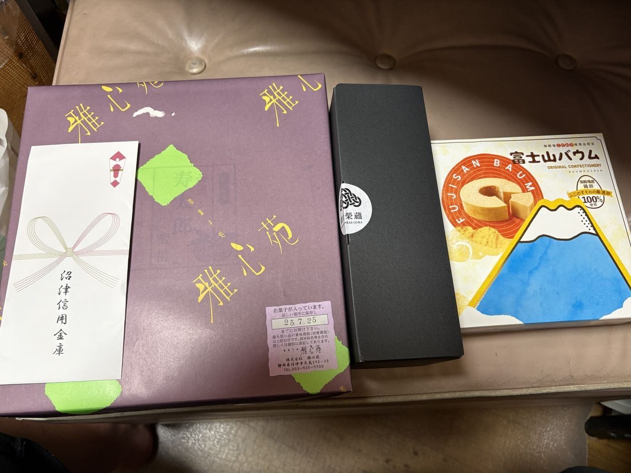 お米券と「雅心苑」の寿太郎ゼリー、榮蔵の日本酒「雪解」、富岳会の富士山バウム。いただきました。